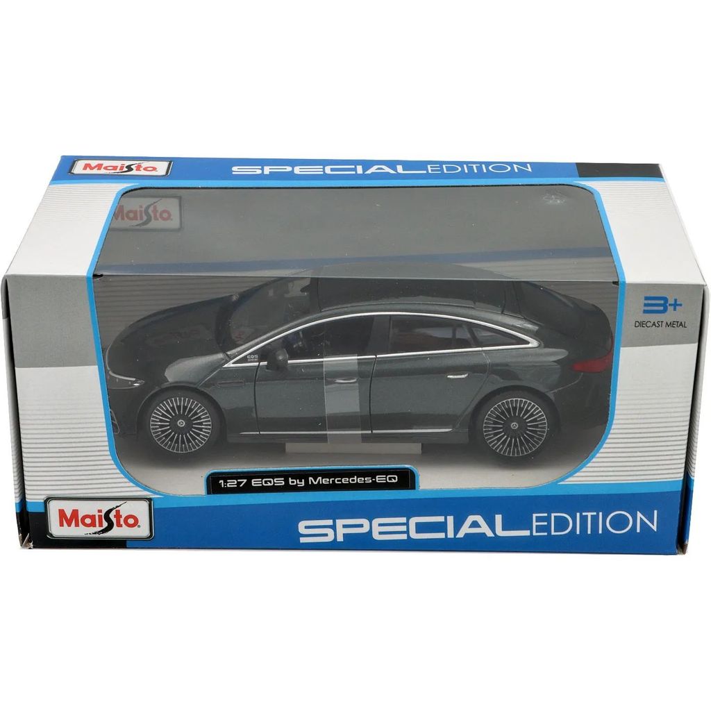 Elbilen Mercedes-Benz EQS i skala 1:27 (19,5 cm) från Maisto. Färgen är mörkgrå metallic.