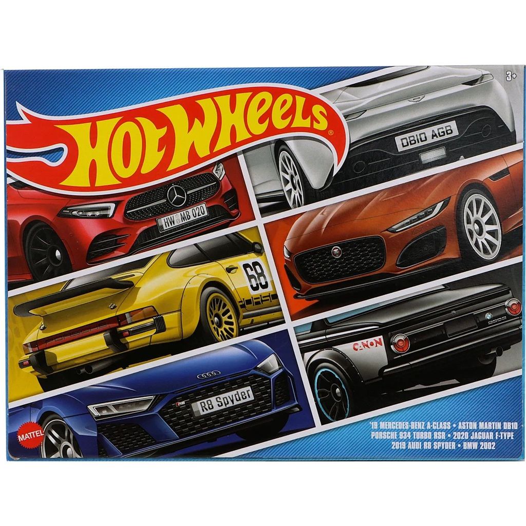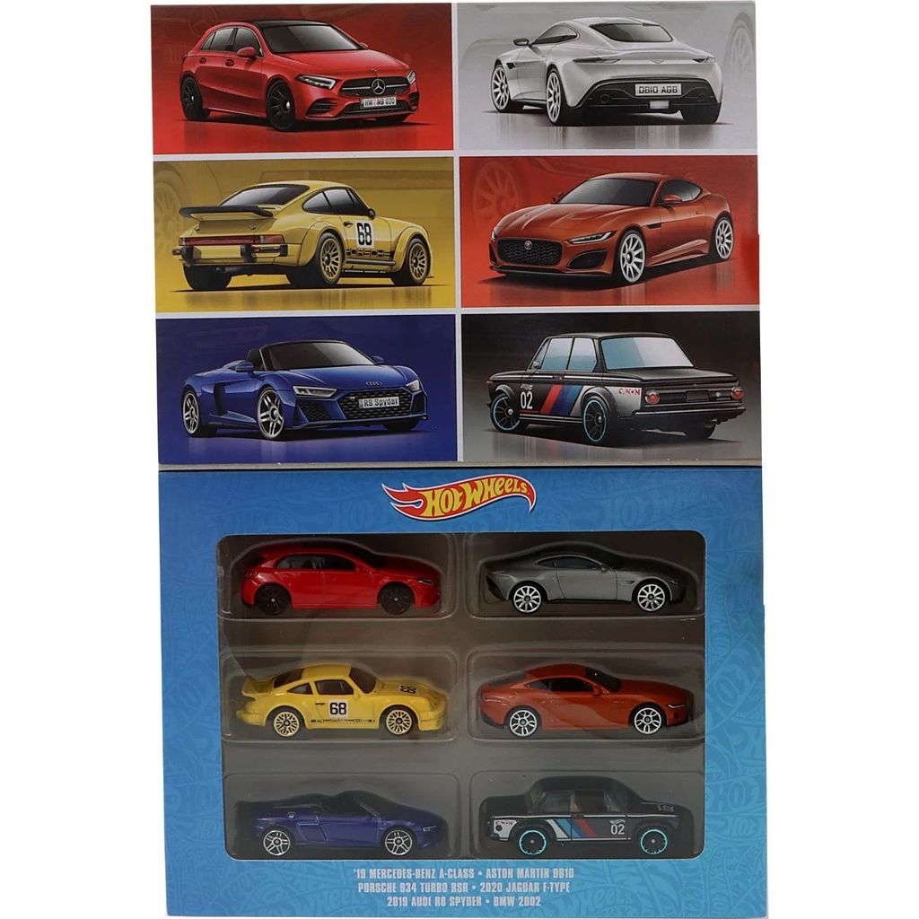 6-pack med bilar från Hot Wheels med europeiska sportbilar (BMW, Jaguar, Audi, Porsche, Aston Martin och Mercedes-Benz).