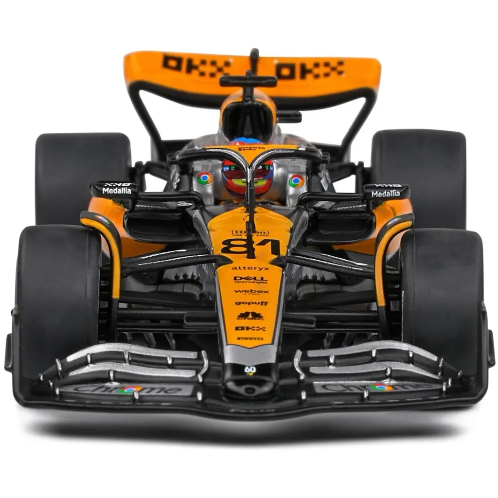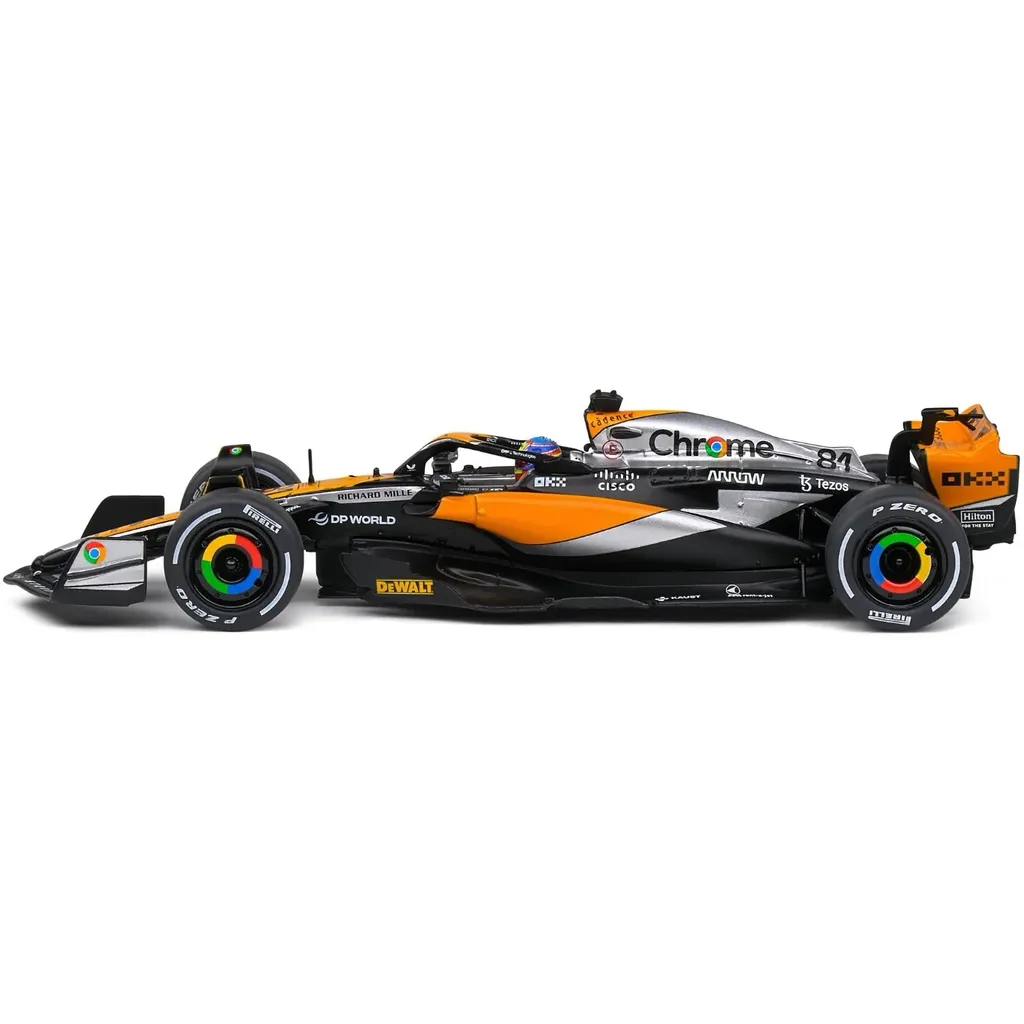Modell av formel 1-bilen MCL60 från McLaren. Denna bil, med nummer 81, kördes säsongen 2023 under Storbritanniens Grand Prix av Oscar Piastri. Bilen ingår i teamet McLaren Formula 1 Team från Storbritannien.
