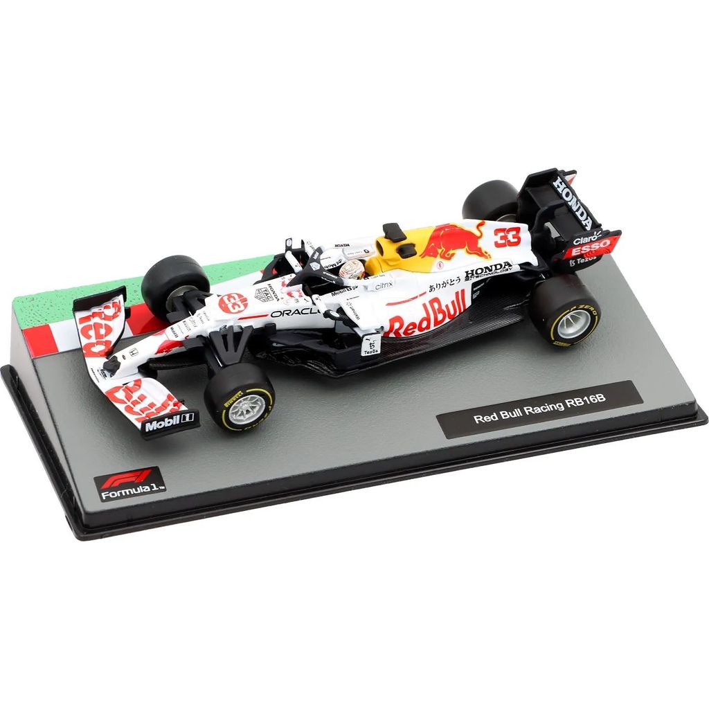 Modellen levereras i en fin vitrinbox med svart bottenplatta och texten "Red Bull Racing RB16B" i vitt.