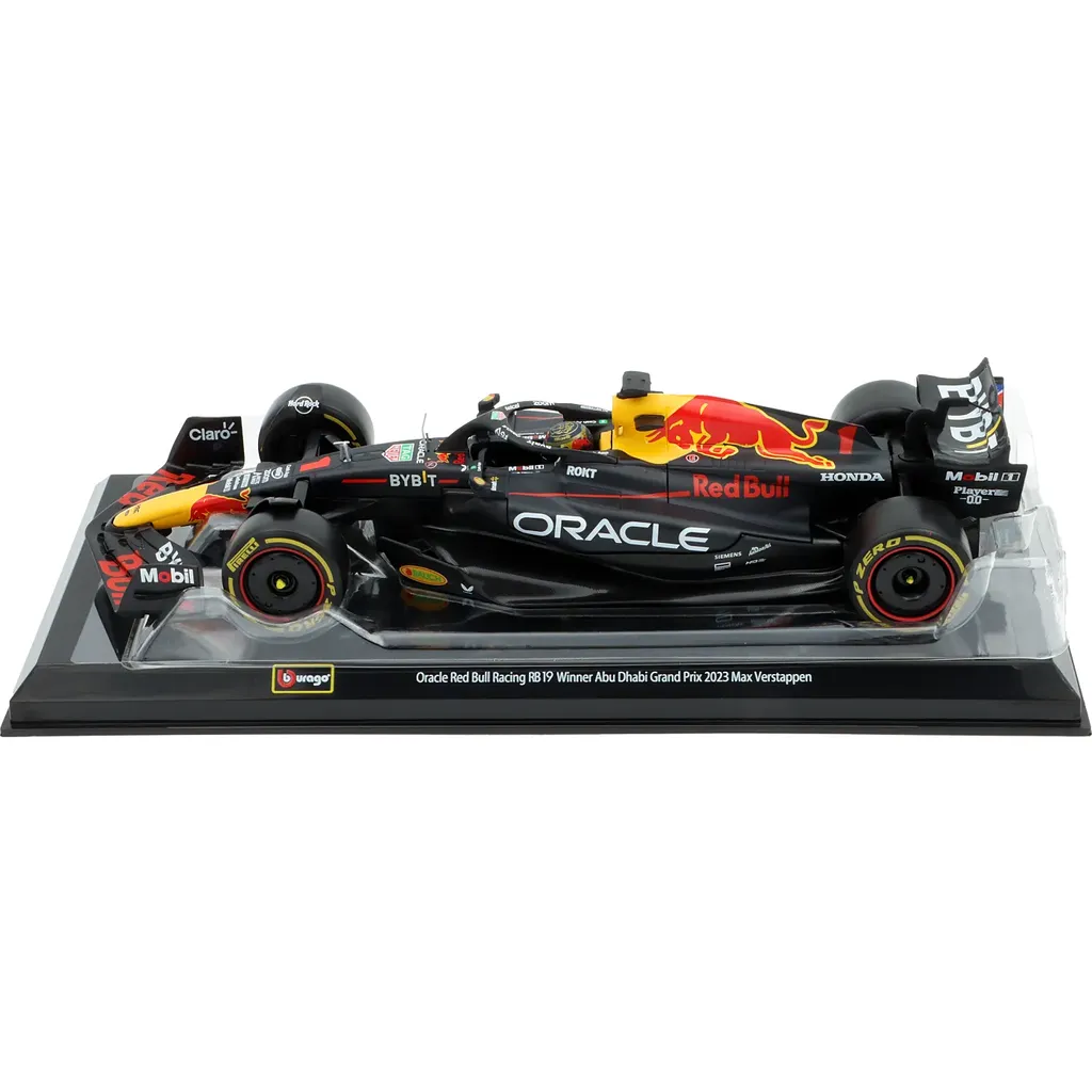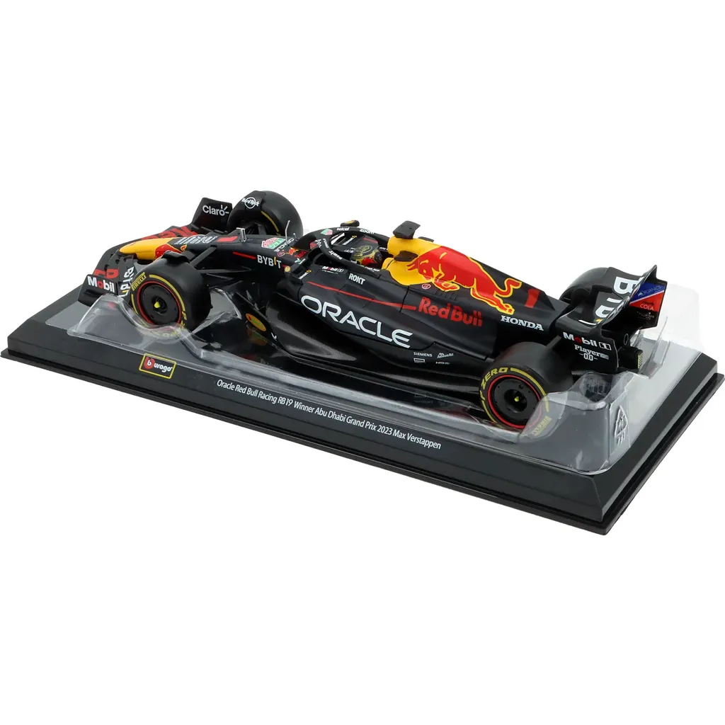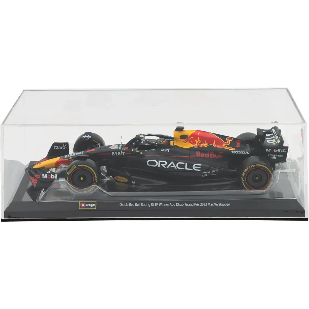 Modellen levereras i en fin akrylbox (showcase) med svart bottenplatta och texten "Oracle Red Bull Racing RB19 Winner Abu Dhabi Grand Prix 2023 Max Verstappen".