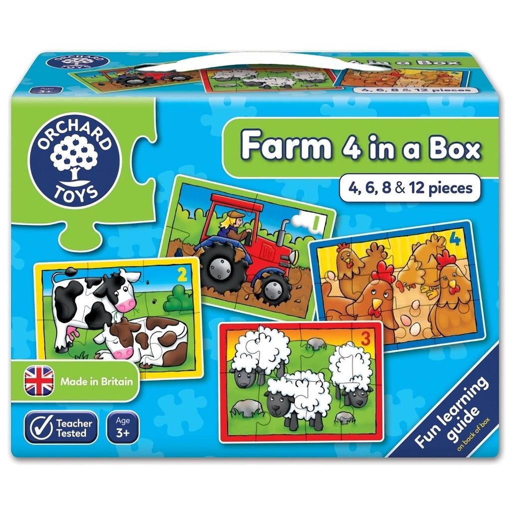 Fyra små pussel med bondgårdstema där pusslens motiv är; traktor, kor, lamm och hönor.