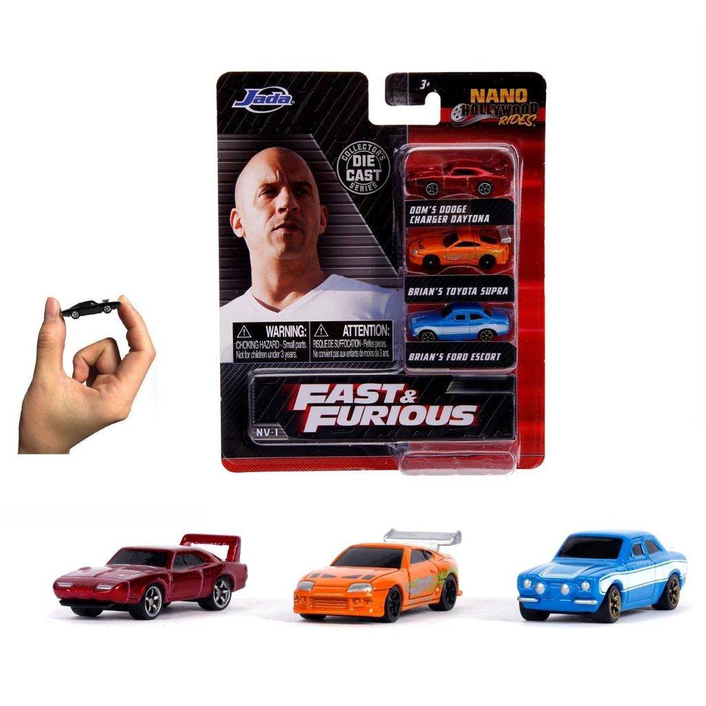 Set med 3 små bilar (nano cars) från Fast & Furious-filmerna från leksakstillverkaren Jada Toys som tillverkar dessa bilar under licens från Universal City Studios. Bilarna som ingår listas nedan och ingår i serien Nano Hollywood Rides, set NV-3, som egentligen är en serie för samlare men bilarna funkar så klart även fint som leksaksbilar.