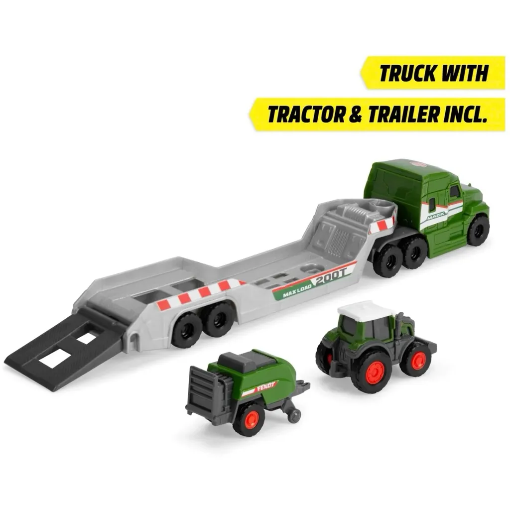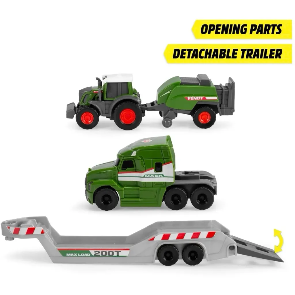 Ekipage med dragbil (Mack Trucks) och trailer som transporterar en Fendt-traktor med balpress från Dickie Toys. Ekipaget mäter 32 cm.