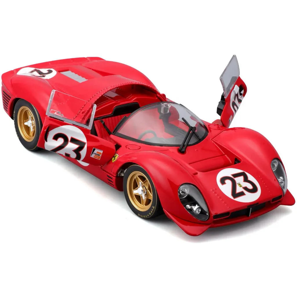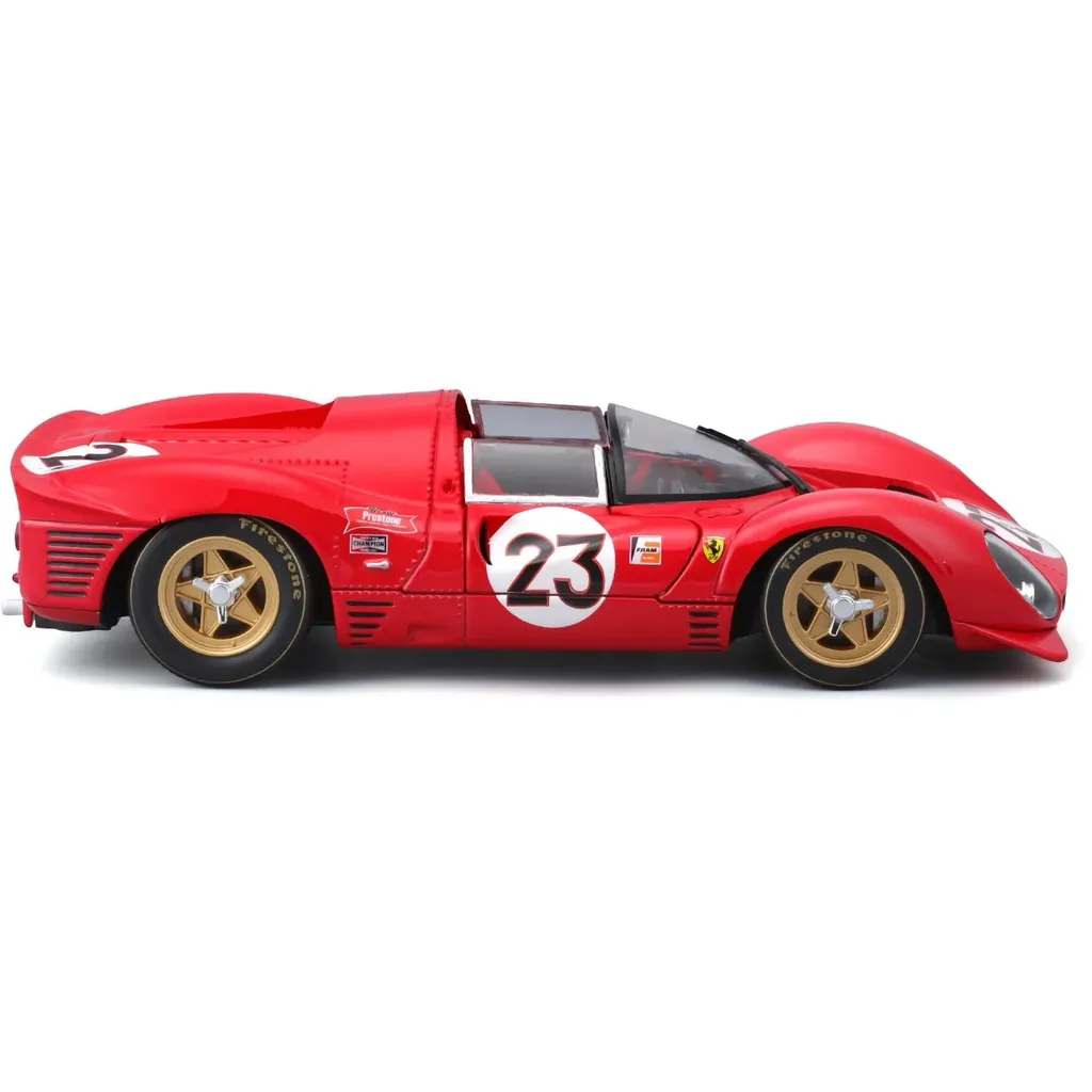 Röd Ferrari 330 P4 Daytona, årsmodell 1967, som modellbil från Bburago och deras serie Racing. Bilen är i skala 1:24 (17 cm) och har öppningsbara dörrar.