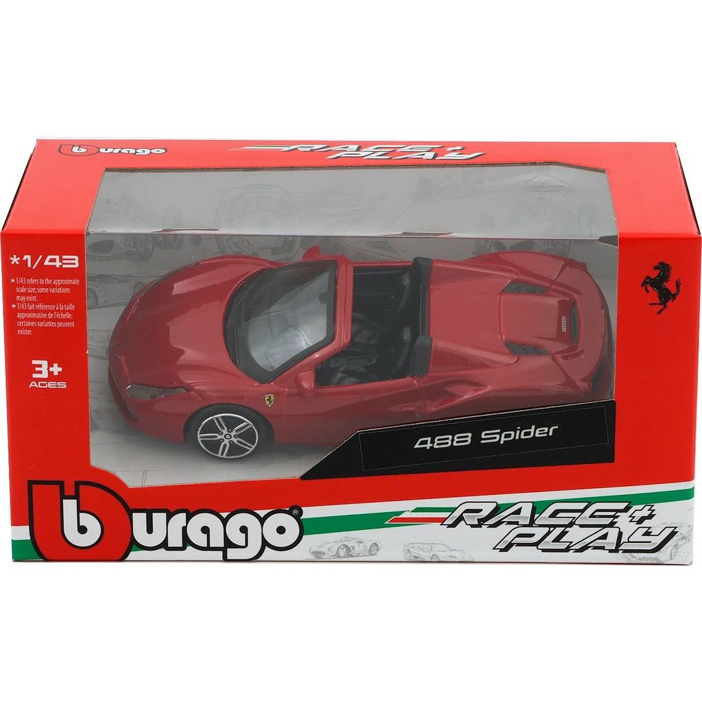 Röd Ferrari 488 Spider från Bburago i skala 1:43 (längd ca 10,5 cm). Årsmodell 2016.
