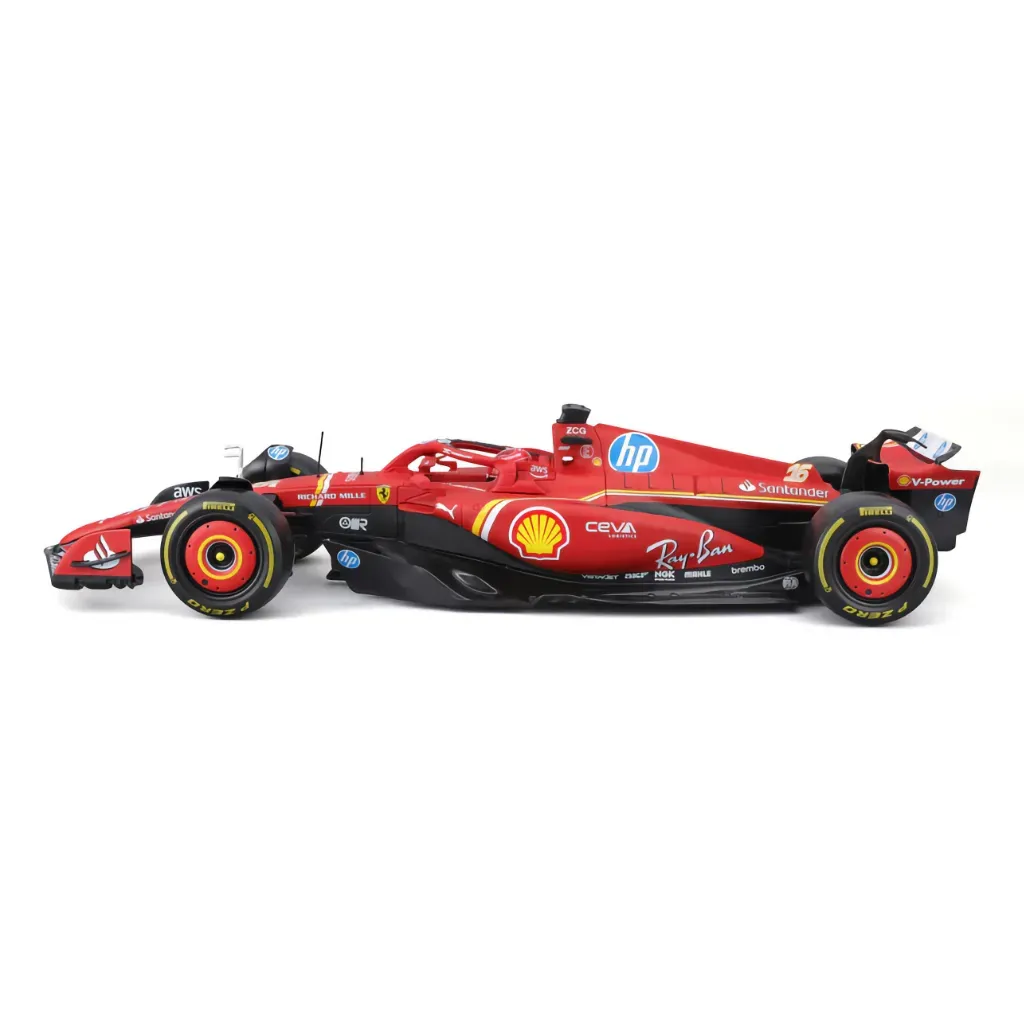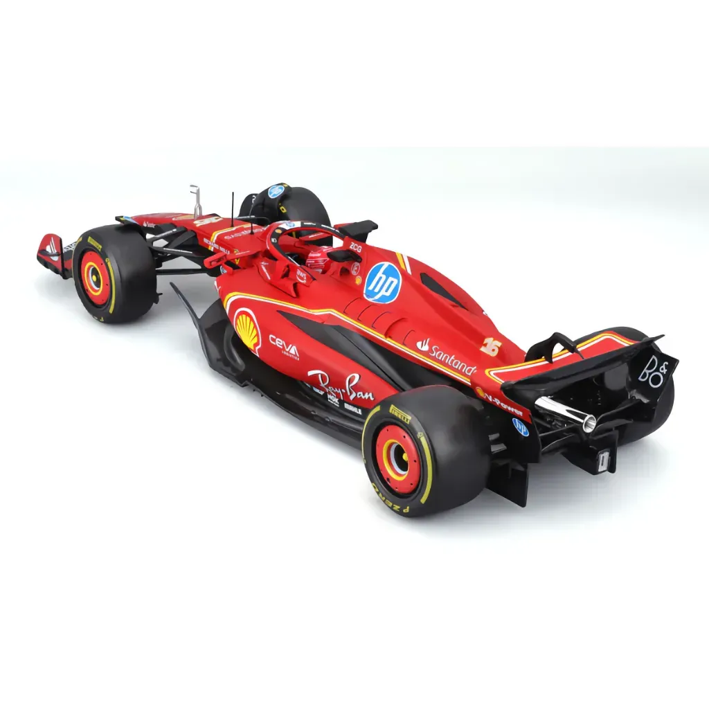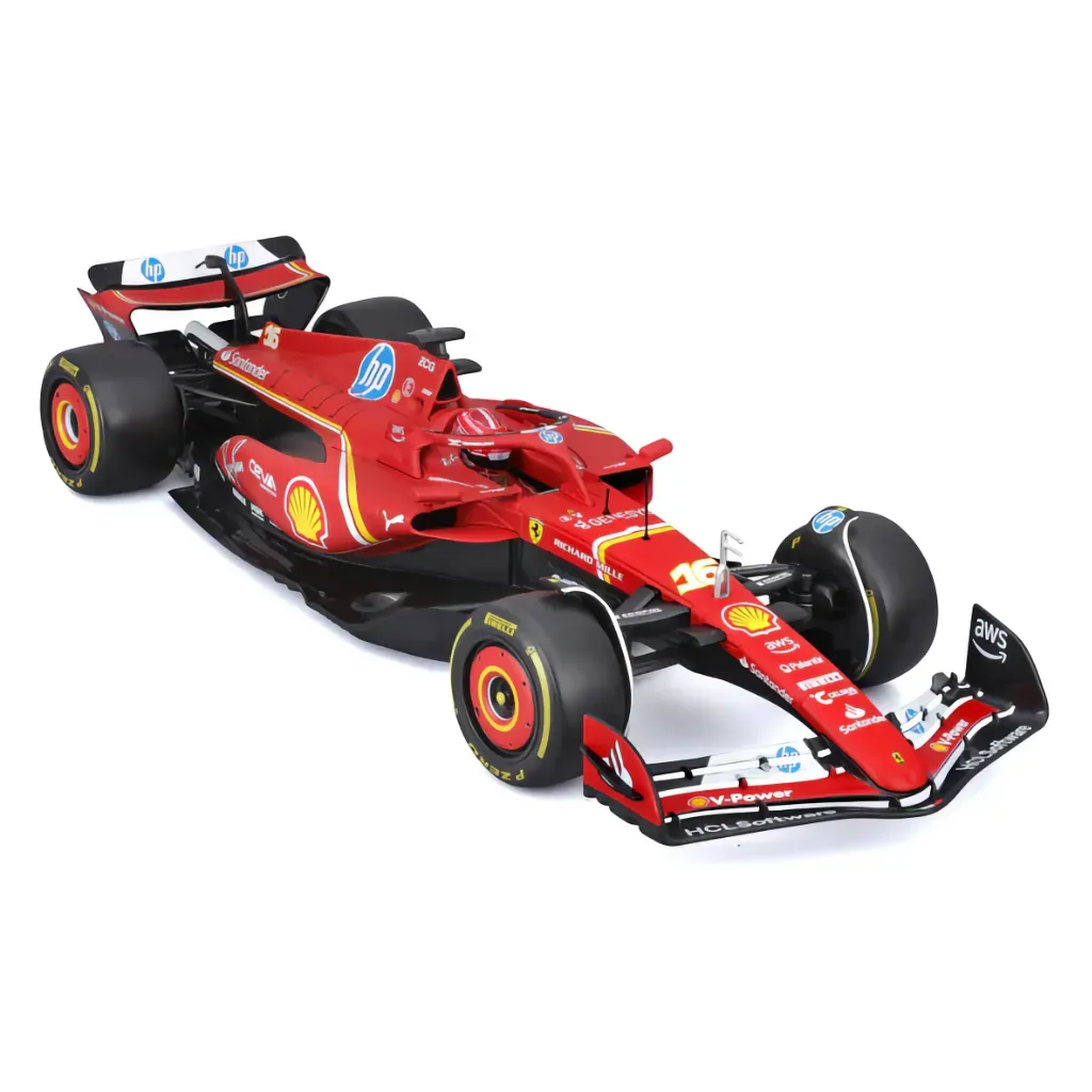 Ferrari SF-24 med nummer 16 kördes av Charles Leclerc under säsongen 2024. Den här modellbilen är tillverkad av Bburago i skala 1:18 vilket innebär att den är 32 cm lång.