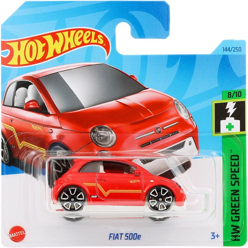 Fiat 500e från Hot Wheels och serien HW Green Speed där denna leksaksbil är bil nummer 8/10. Bilen är nummer 144/250 från 2023 och har ett short card (5785). Bilens artikelnummer är HKK24. Just denna bil ingår i bland annat M case 2023.