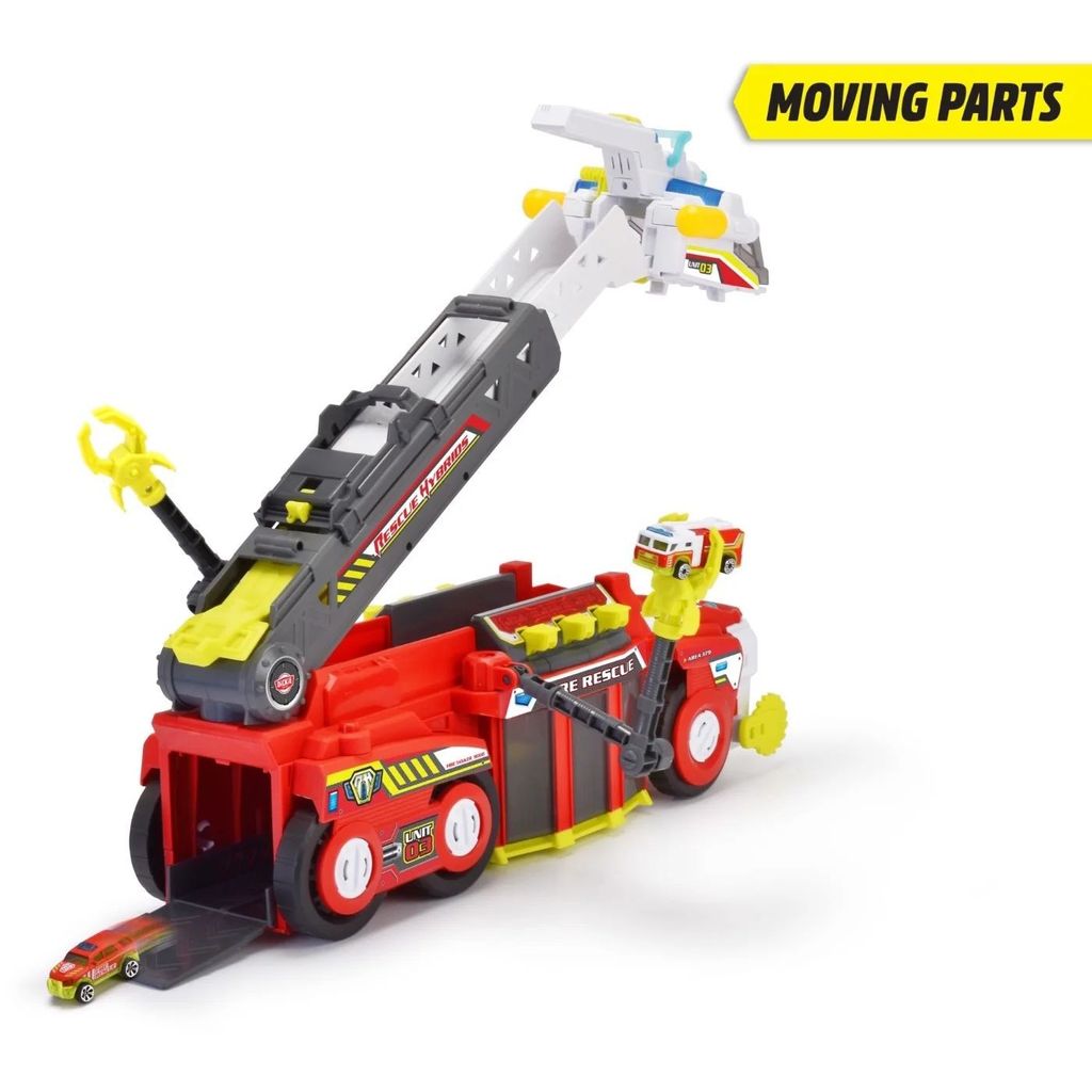 Denna brandbilsrobot kan kombineras och "dockas" med andra produkter ur serien Rescue Hybrids från Dickie Toys. Se bilder där denna brandbil dockas med polisroboten Police Bot.