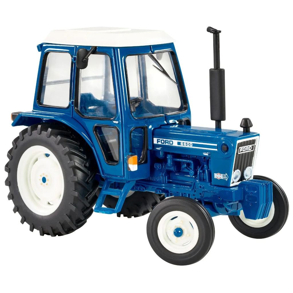 Traktor i die cast (metall) med plastdetaljer och gummidäck. Traktorn är en blå Ford 6600 i skala 1:32 (12 cm).