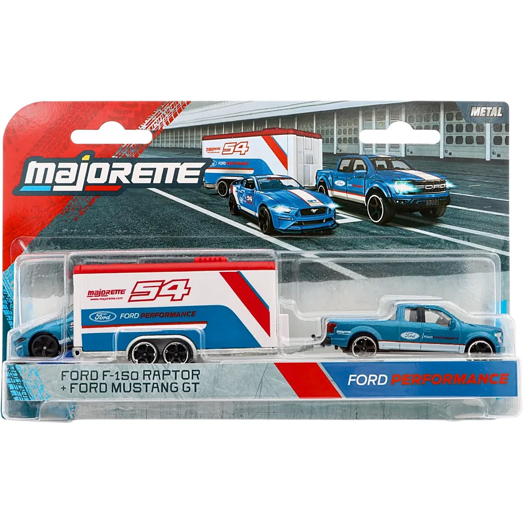 Race Trailer från Majorette med en Ford F-150 Raptor som drar en täckt trailer med en Ford Mustang GT. Bilarna bildar raceteamet Ford Performance.