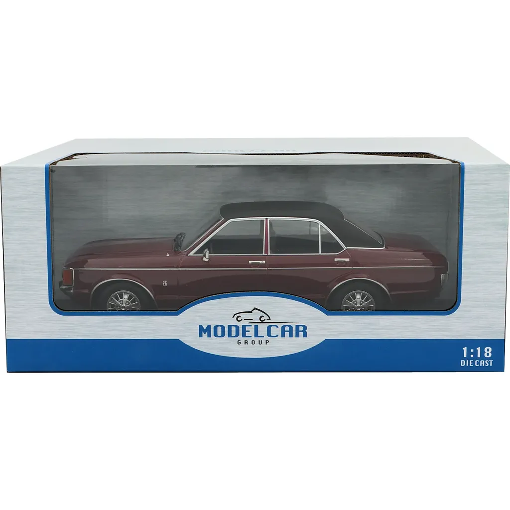Mörkröd och svart Ford Granada MK I, årsmodell 1975, som modellbil från tyska Modelcar Group. Modellen är i skala 1:18 (25,5 cm).