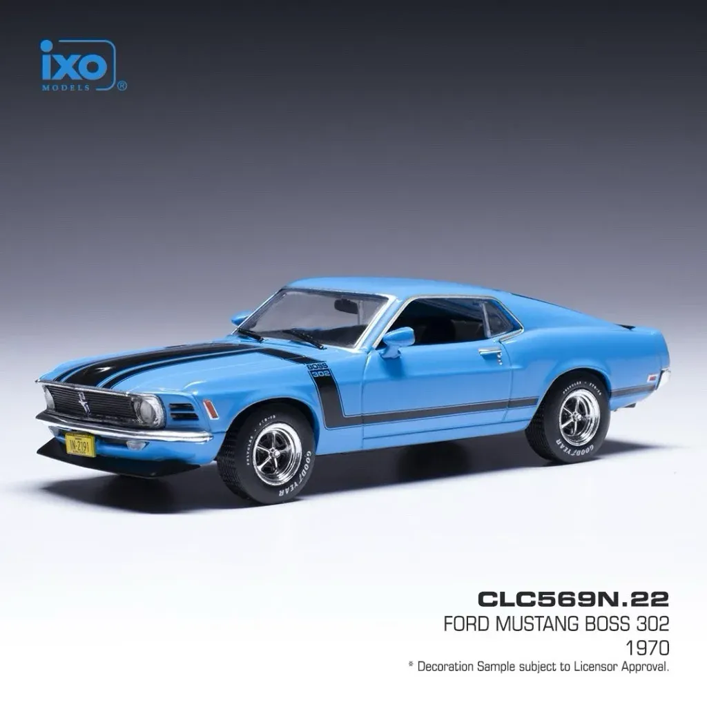 Ford Mustang Boss 302, årsmodell 1970, i blått med svarta detaljer som modellbil från Ixo Models. Modellen är i skala 1:43 (11 cm).