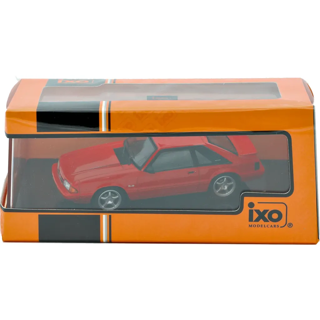 Ford Mustang LX 5.0 Coupe, årsmodell 1992 (3:e generationen), som modellbil från Ixo Models i skala 1:43 (10,5 cm). Röd lack med silverfälgar.