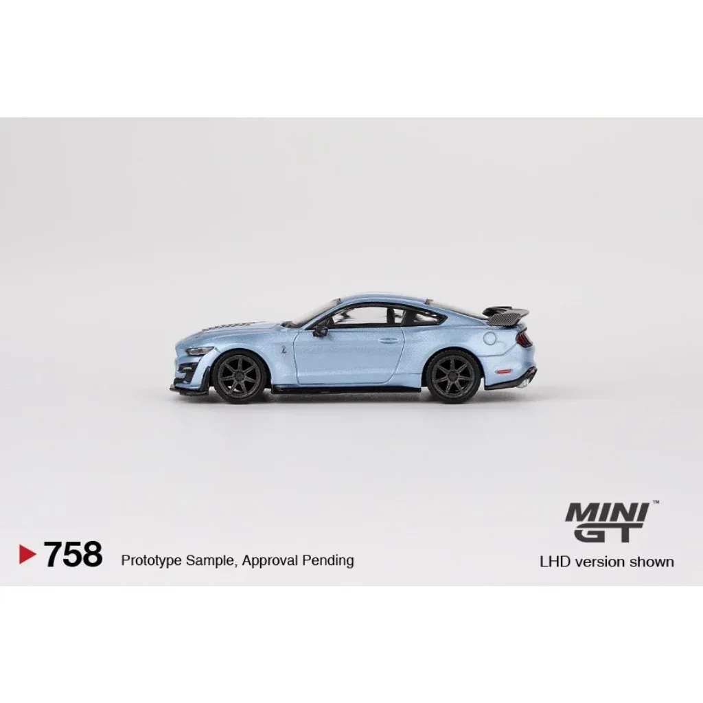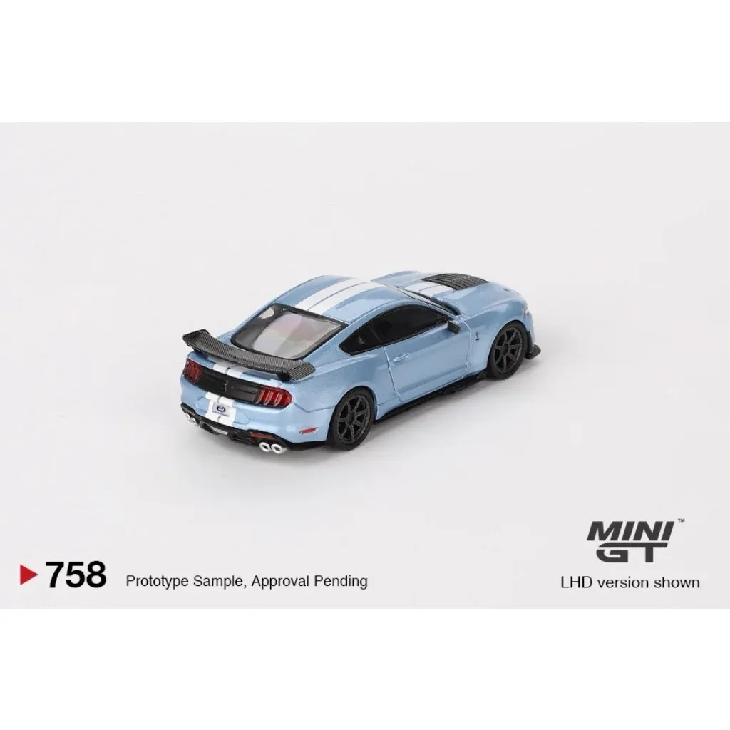Ford Mustang Shelby GT500 Heritage Edition i blått från Mini GT i skala 1:64 (ca 7 cm). Bilen har produktnummer 758 hos Mini GT. Den här versionen är vänsterstyrd (LHD) med ratten på vänster sida.