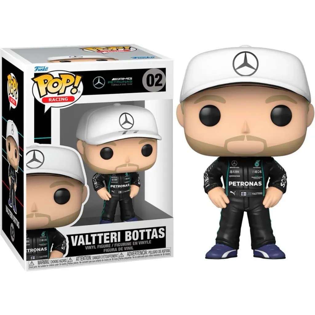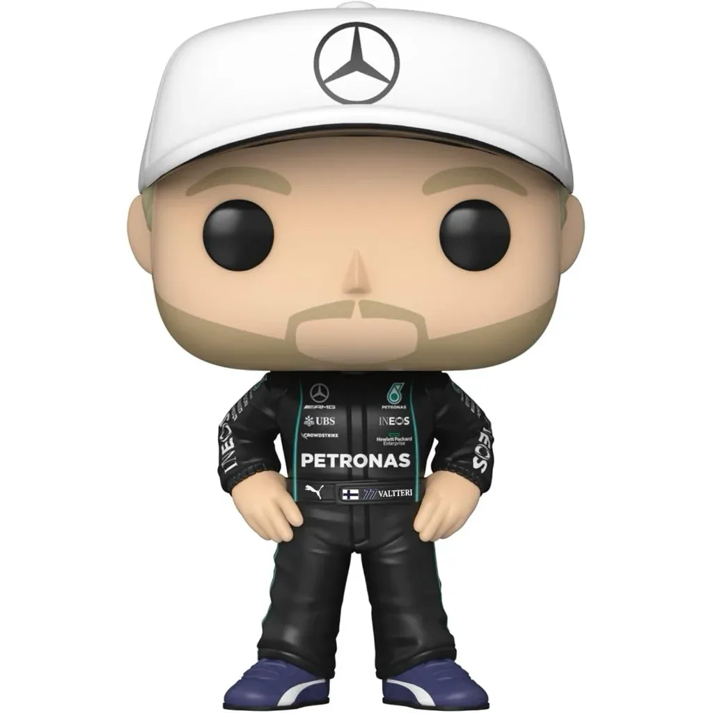 Valtteri Bottas kör för F1-stallet Mercedes-AMG PETRONAS Formula One Team och denna Funko Pop har så klart teamets kläder och en passande vit keps med Mercedes-logga.