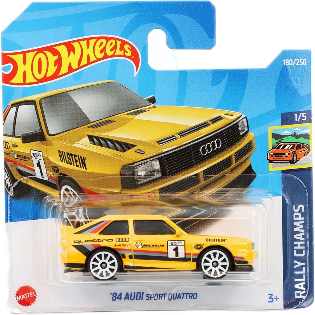 ?84 Audi Sport Quattro från Hot Wheels och serien Rally Champs där denna gula Audi Sport Quattro är bil nummer 1/5.