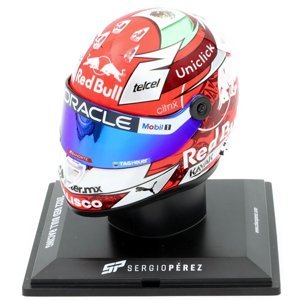 Minihjälm i skala 1:4 där Sergio Pérez hjälm från Austrian GP 2022 avbildats av Schuberth. Säsongen 2022 körde Sergio bil #11 för teamet Oracle Red Bull Racing.