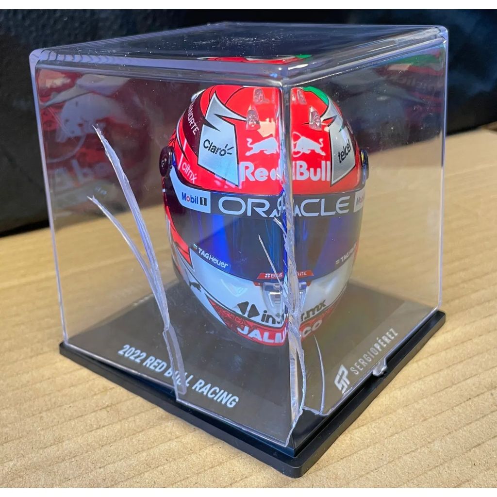 OBS! Skadad akrylbox, se bild. Ingen skada på hjälmen. Därav sänkt pris. Hjälmen är fin att ställa upp i ett vitrinskåp t.ex. utan vitrinbox. Den skadade akrylboxen medföljer. Sergio Pérez hjälm från Austrian GP 2022 som modell i skala 1:4 tillverkad av Schuberth.