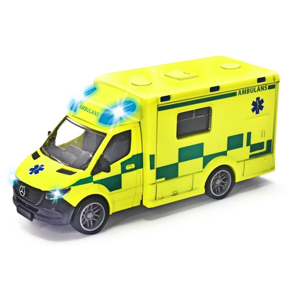 Svensk ambulans från Majorette och serien "Grand Series - SOS". Ambulansen är en Mercedes-Benz Sprinter i leksaksversion som mäter 15 centimeter i längd. Leksaksambulansen har ljud- och ljusfunktioner (sirener) som drivs av två AAA-batterier som är installerade i ambulansen, men köp gärna till extra.