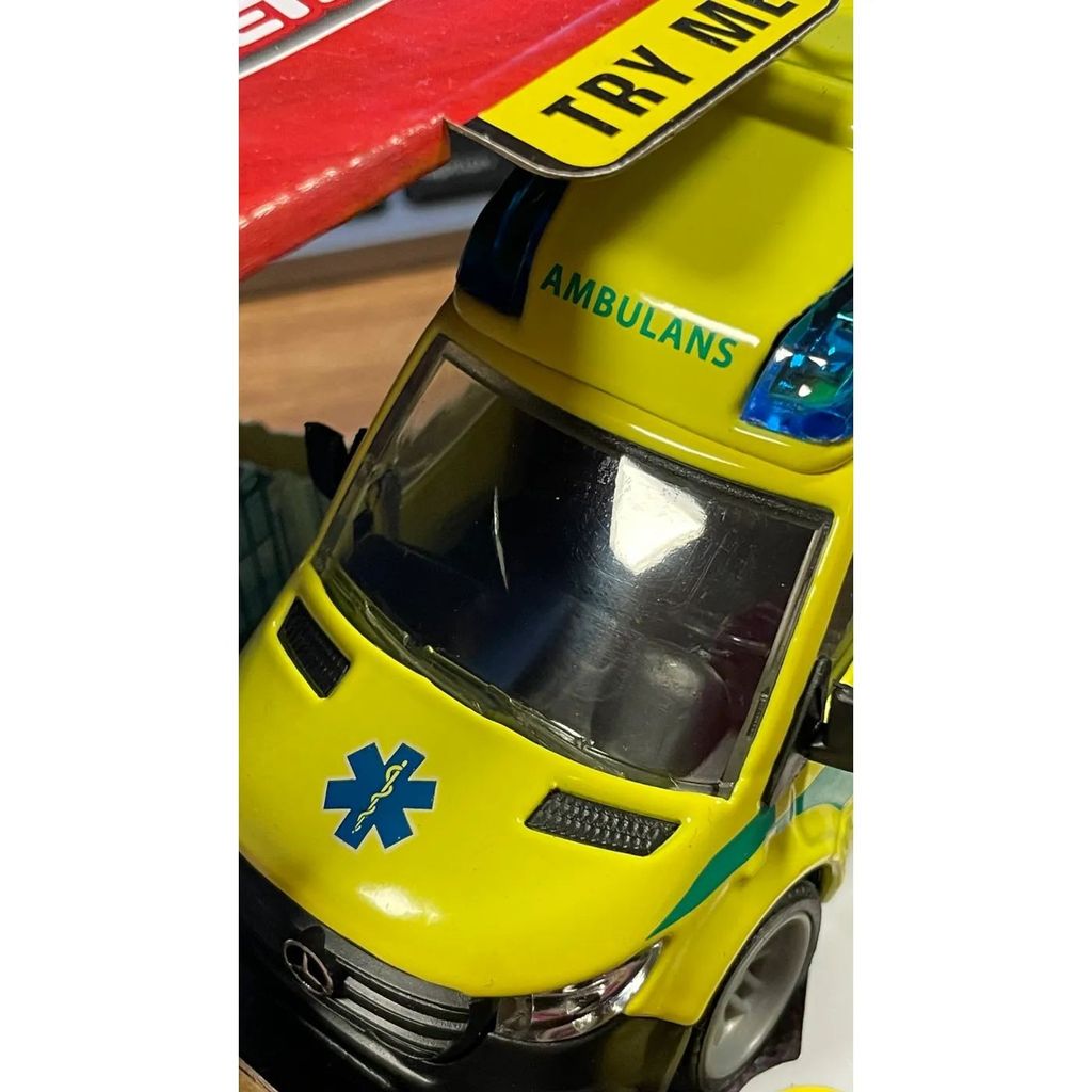 OBS FYNDVARA! - Ambulansen har en spricka i framrutan (se bild). En väldigt liten spricka som vi tror är på insidan då den inte känns när man känner med fingret på utsidan. Så här har du chansen att fynda en bil för lek men mindre skavank för bra peng.