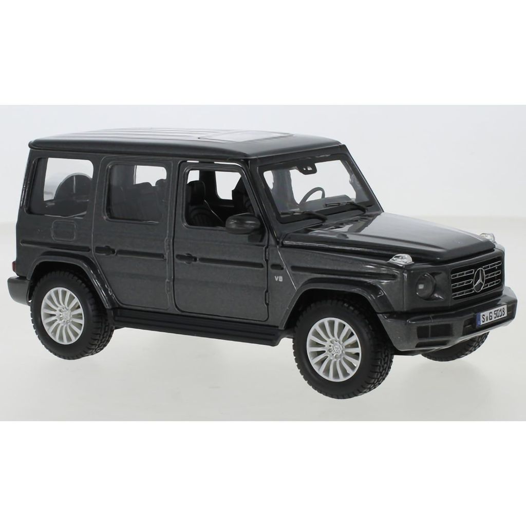 Modellbil i metall (die-cast) från Maisto i form av en Mercedes-Benz G-Class i skala 1:25 (ca 18 cm lång). Färgen är gråmetallic och bilen har öppningsbara dörrar och motorhuv.