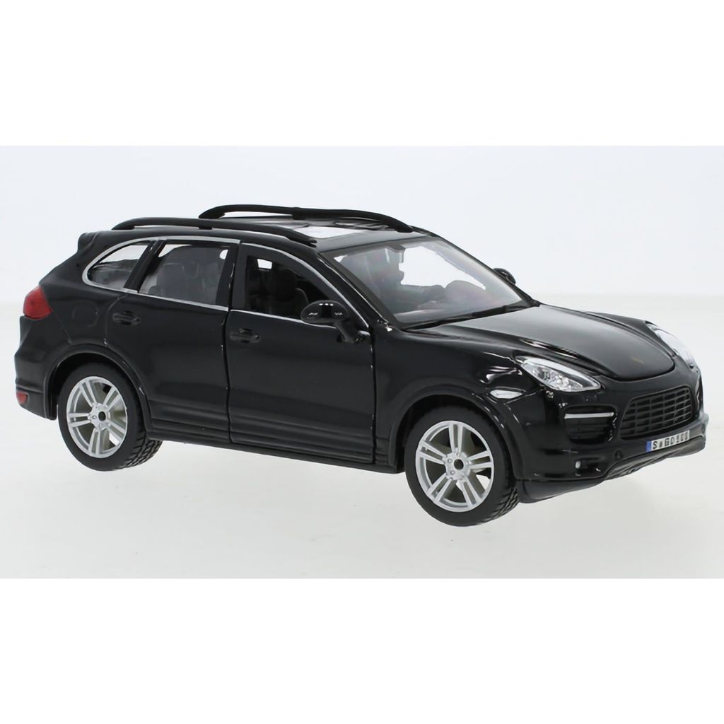 Modell från Bburago i skala 1:24 av en svart Porsche Cayenne Turbo (generation 2). Modellbilen har öppningsbara framdörrar och motorhuv.
