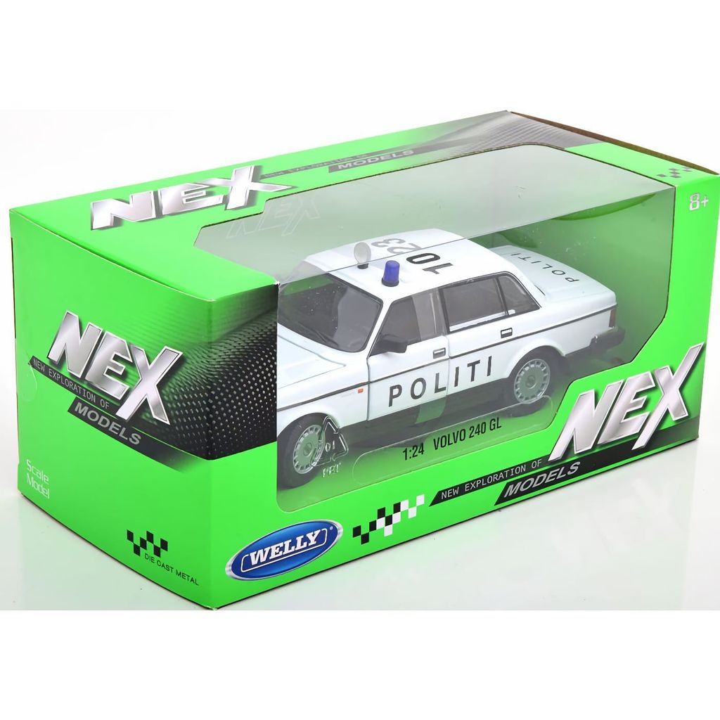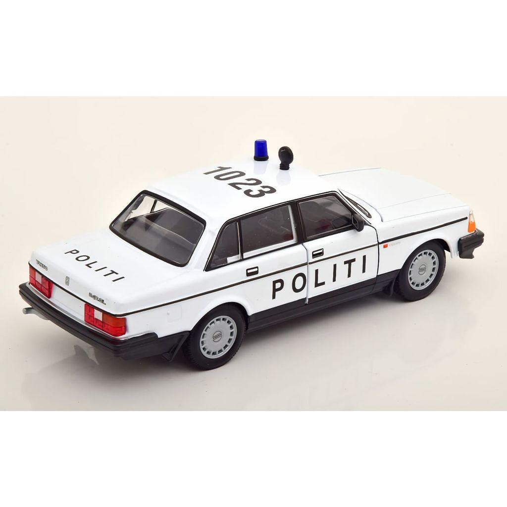 Dansk polisbil i form av en Volvo 240 GL från 1986. Modellbilen är från tillverkaren Welly och är i skala 1:24 (längd ca 19 cm).
