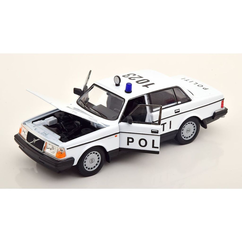OBS! Något skadad förpackning. Inget fel på bilen. Därav sänkt pris. Skadan syns inte på bilden. Polisbil från Danmark i form av en Volvo 240 GL årsmodell 1986.