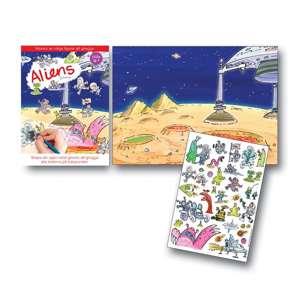 Gnuggisar från engelska varumärket Scribble Down. Gnuggisarna "gnuggas" på bakgrunden och den som gnuggar på de olika figurerna och objekten (aliens, rymdfarare med mera) kan således skapa sitt eget motiv.