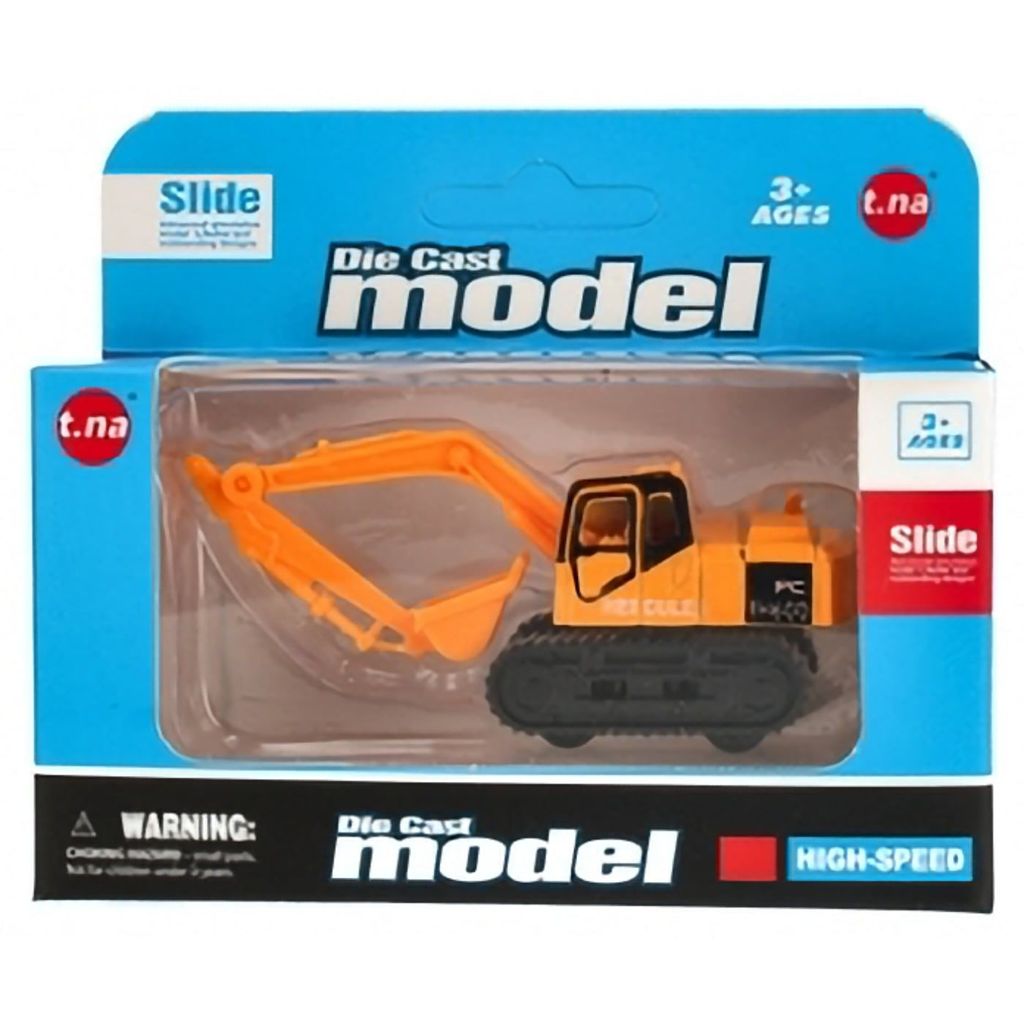 Liten gul grävmaskin som leksaksbil. Längden är ca 8 cm med skopan och leksaken är av metall och plast.