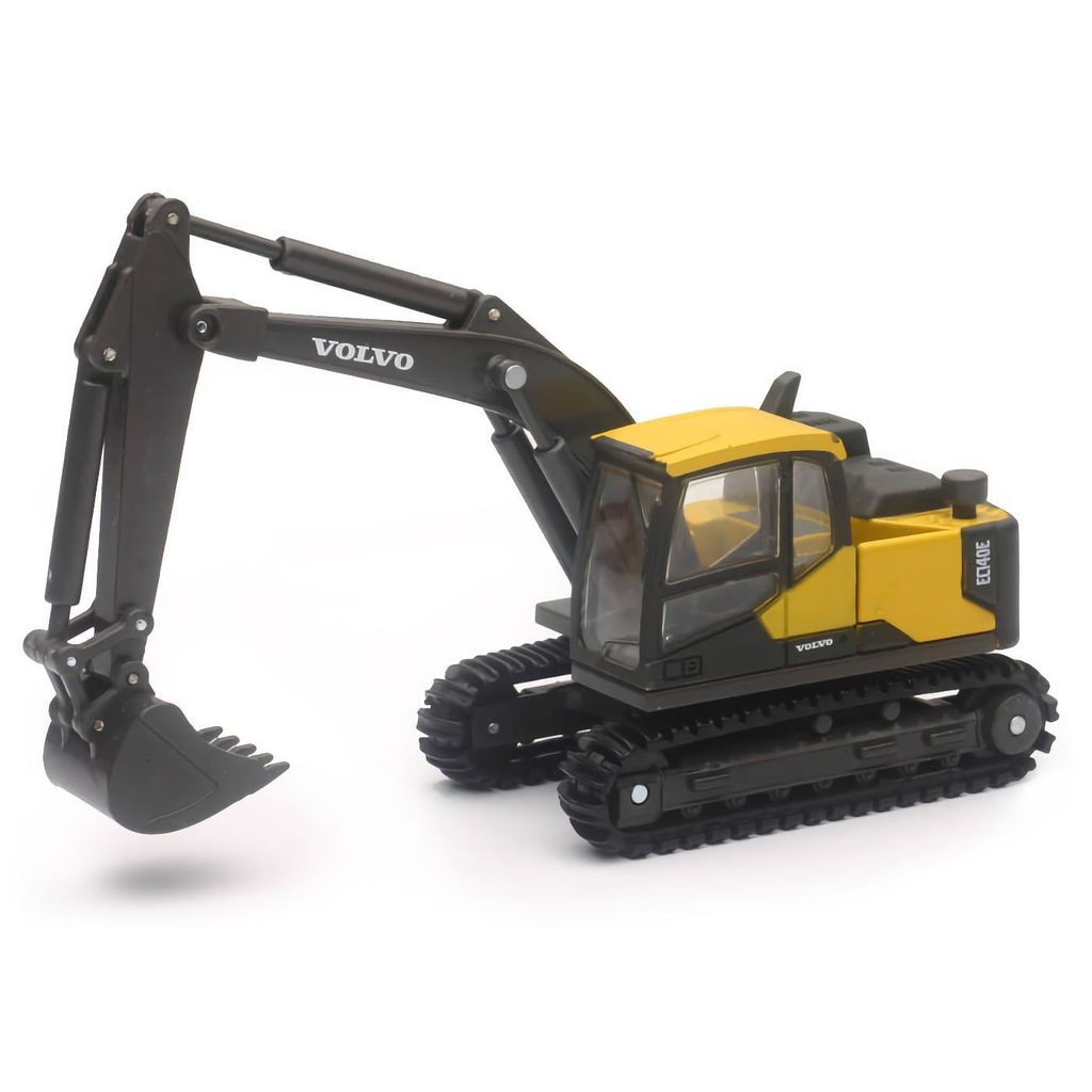 Leksaksgrävare i form av Volvo EC140E som är en modell av den riktiga grävmaskinen med samma beteckning. Den här leksaksgrävmaskinen är i metall och plast och ca 14 cm lång.