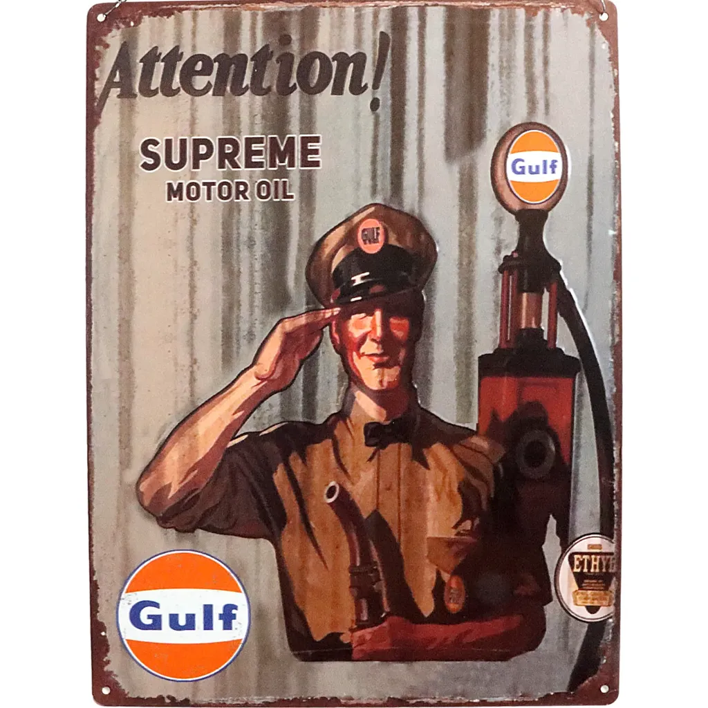 Gulf bensinpump som motiv på en plåtskylt. Skylten är 30 cm bred och 40 cm hög.