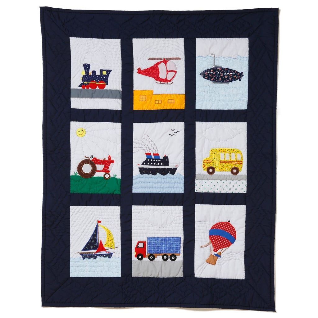 Handquiltat Babytäcke med fordonsmotiv (lok, helikopter, ubåt, traktor, färja, buss, segelbåt, lastbil och luftballong).