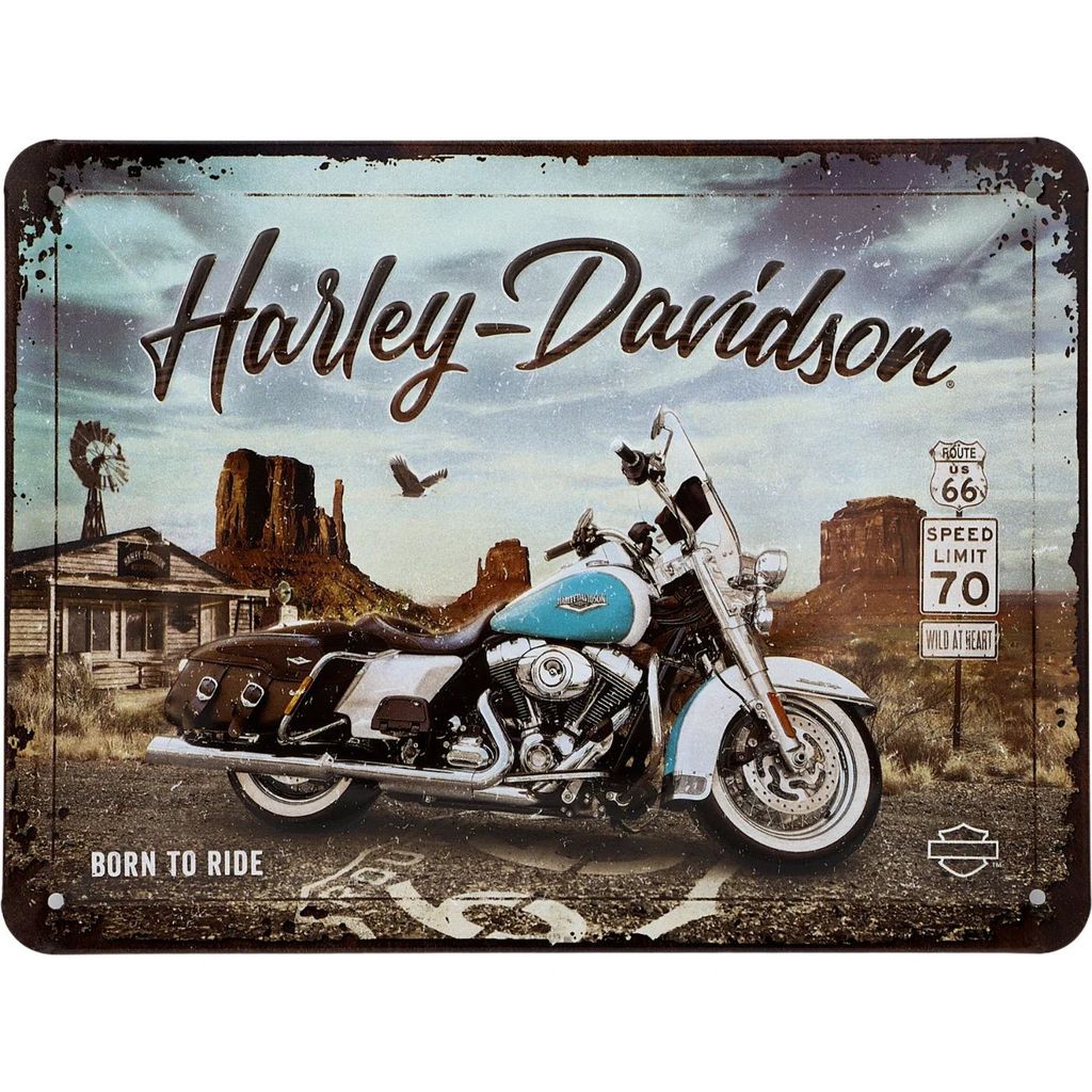 Plåtskylt med motiv av en Harley-Davidson på Route 66 och texten på skylten är "Harley-Davidson - Born to Ride".