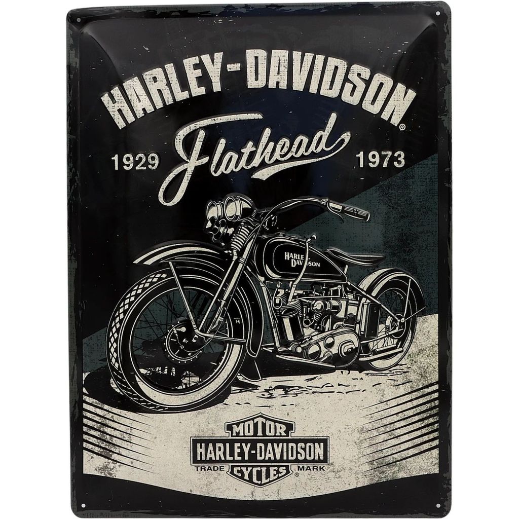 Plåtskylt med motiv av en Harley-Davidson Flathead och texten "Harley-Davidson Flathead 1929-1973".