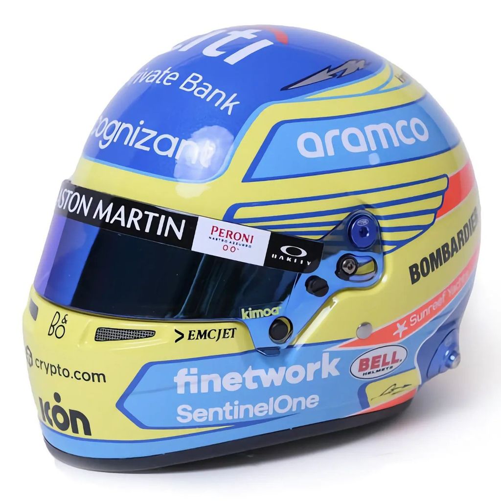 Minihjälm i skala 1:2 (ca 18 cm bred och 13 cm hög) där Fernando Alonsos hjälm från 2023 avbildats av Bell Helmets. Säsongen 2023 kör Alonso bil #14 för teamet Aston Martin Aramco Cognizant F1 Team.