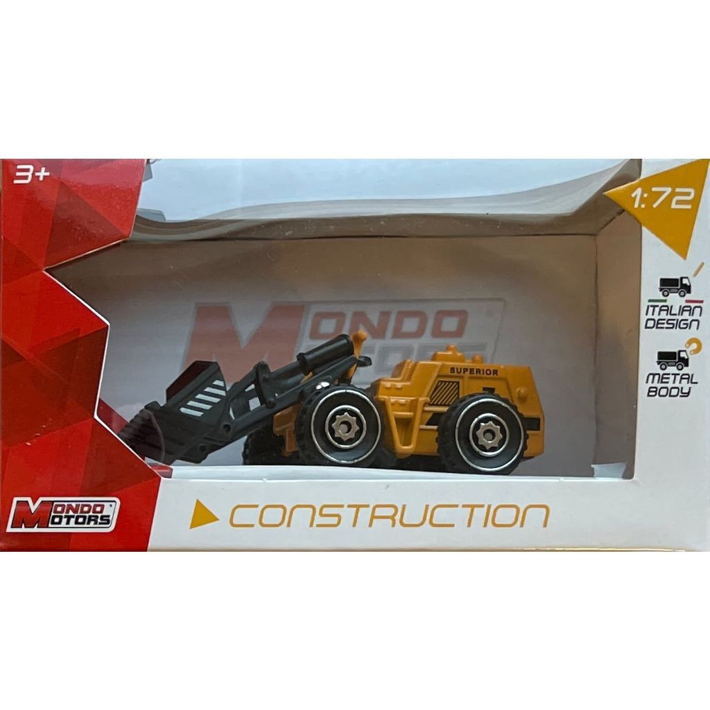 Fin liten gul hjullastare (traktor) utan hytt med skopa. Leksaken är i metall från italienska Mondo Motors. Hjullastarens kaross är i metall medan skopa, hjul och chassi är i plast. Leksakstraktorn är ca 7 cm lång och skalan är 1:72.