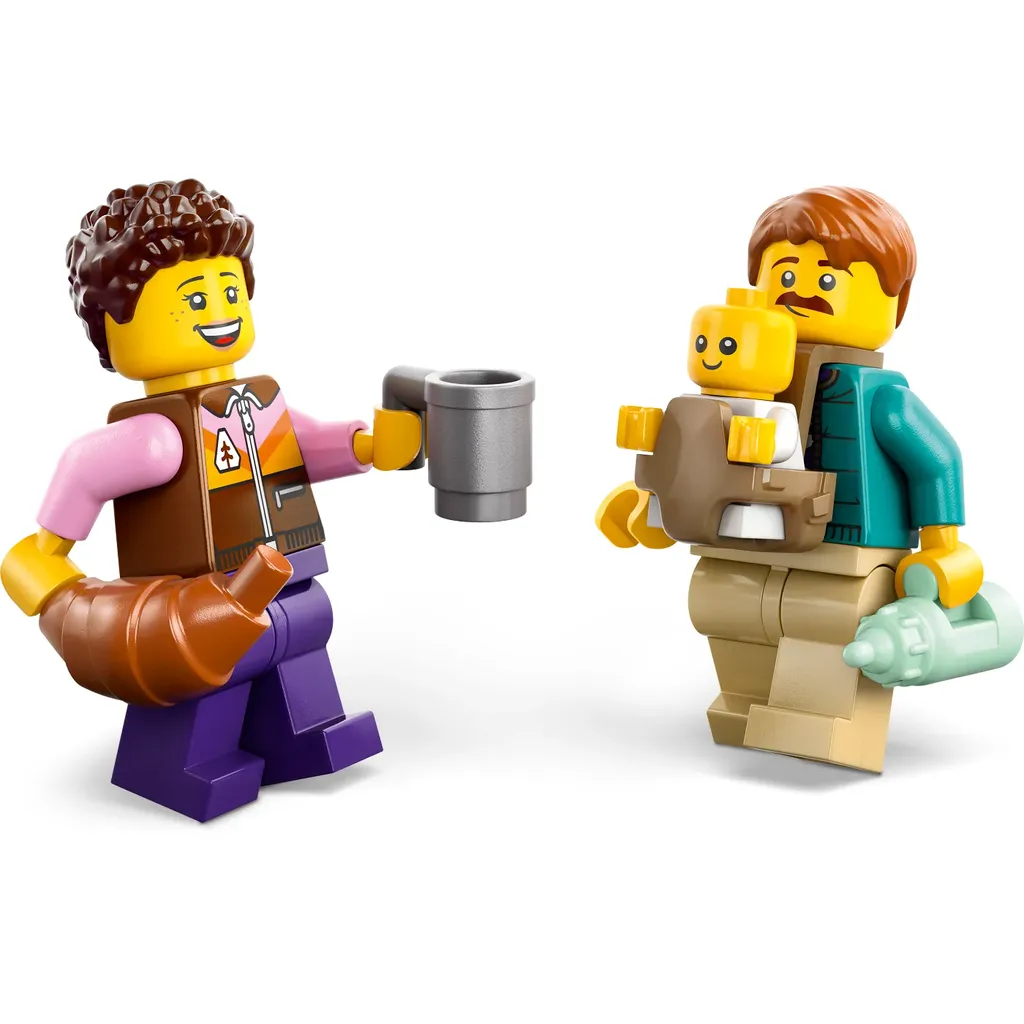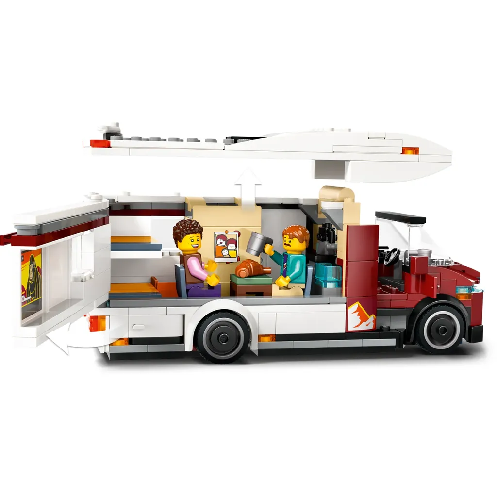Husbilen har flera trevliga funktioner som ett bostadsutrymme med kök, toalett, våningssängar och en spjälsäng till bebisen. Medföljer gör bord och stolar, en gitarr och en lägereld. Förutom bebis-minifiguren medföljer så klart mamma och pappa med på husbilssemestern.