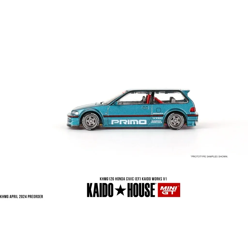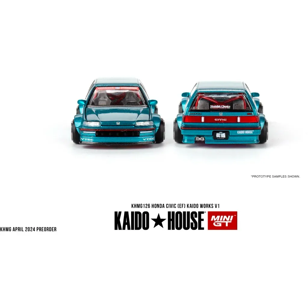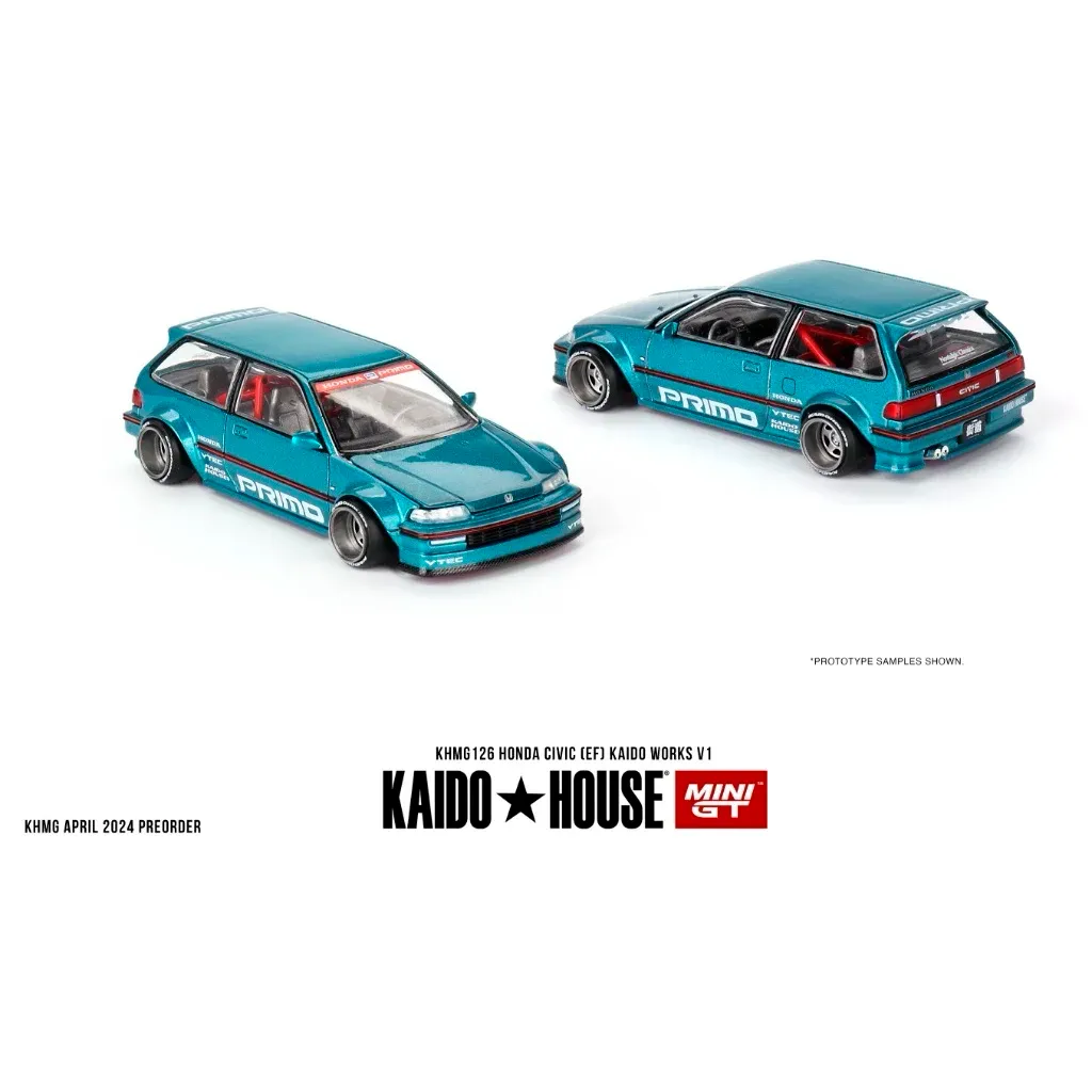 Honda Civic (EF) Kaido Works V1 från Mini GT i samarbete med Kaido House. Bilen är tillverkad i metall och har gummidäck. Skalan är 1:64 (ca 7 cm).
