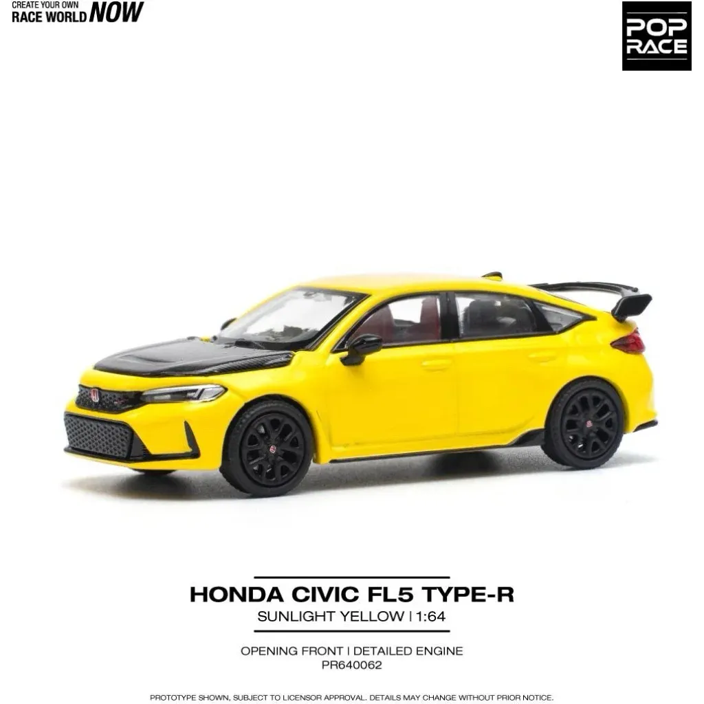 Honda Civic Type R FL5 i gult (Sunlight Yellow) från Pop Race i skala 1:64 (ca 7 cm).