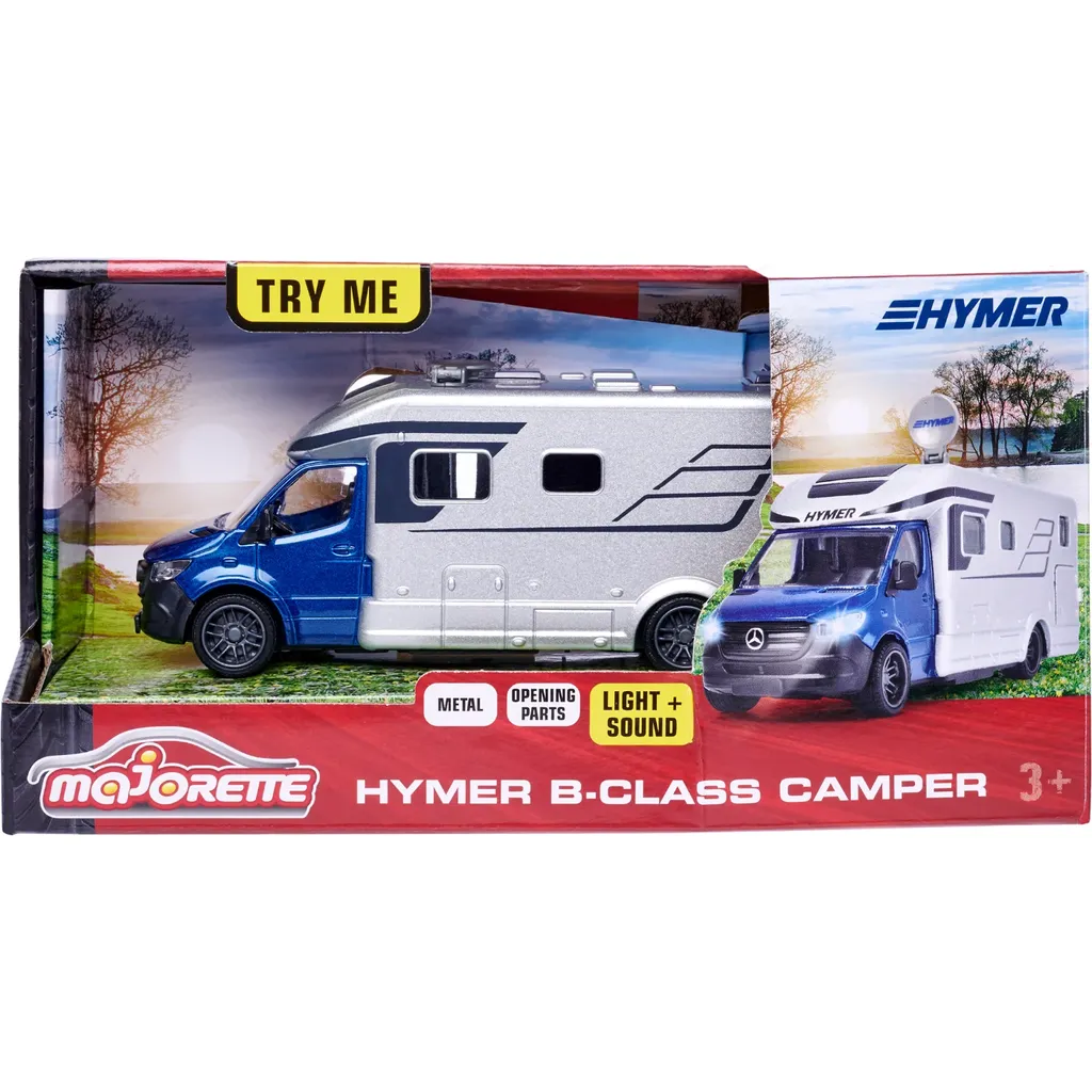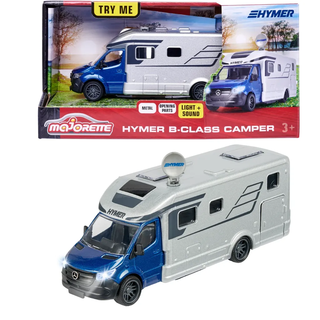 I Majorettes serie "Grand Series - City" ingår denna fina husbil i form av en Hymer B-Class Camper med ljud- och ljusfunktioner. Husbilen är i skala 1:43 och 19 cm lång.