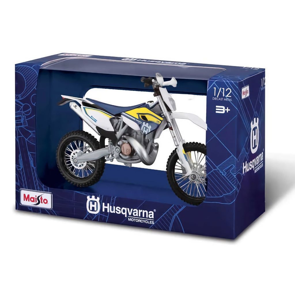 Husqvarna crossmotorcykel i skala 1:12 (18 cm). Motorcykeln är en modell av Husqvarna FE 501 tillverkad av Maisto i metall med plastdetaljer.