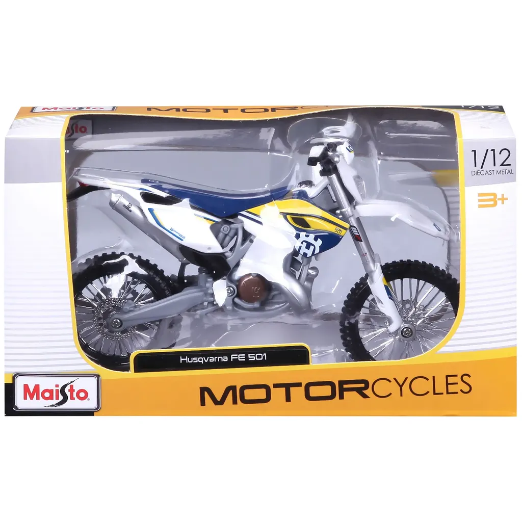 Husqvarna crossmotorcykel i skala 1:12 (18 cm). Motorcykeln är en modell av Husqvarna FE 501 tillverkad av Maisto i metall med plastdetaljer. Däck av gummi.