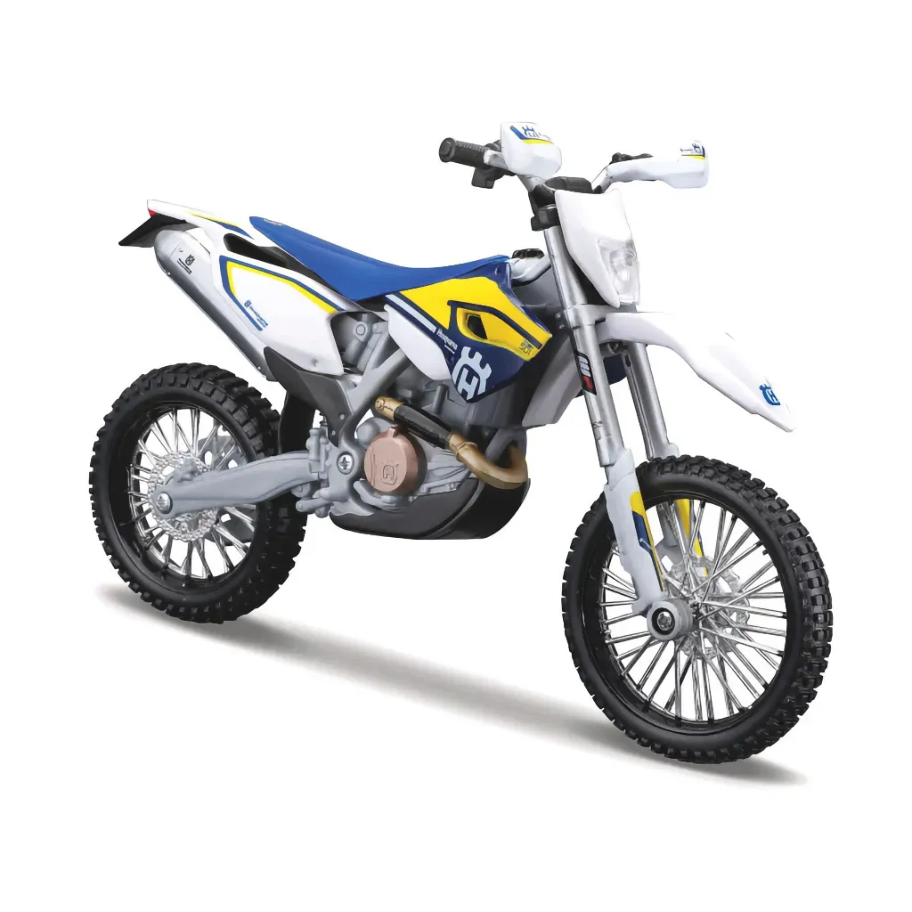 Husqvarna crossmotorcykel i skala 1:12 (18 cm). Motorcykeln är en modell av Husqvarna FE 501 tillverkad av Maisto i metall med plastdetaljer.