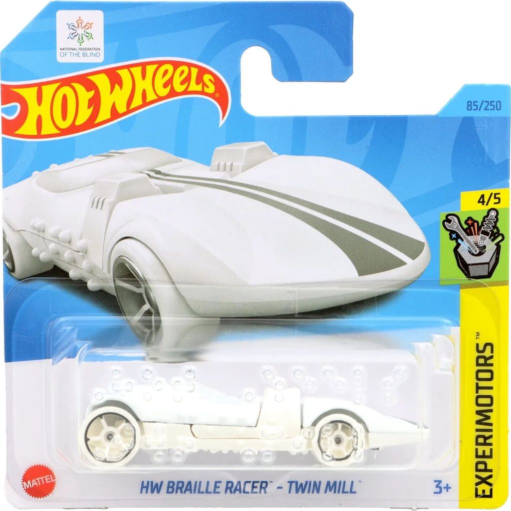 HW Braille Racer - Twin Mill från Hot Wheels och serien Experimotors där denna leksaksbil är bil nummer 4/5. Bilen ingår i E-case 2023 (short cards / 5785).