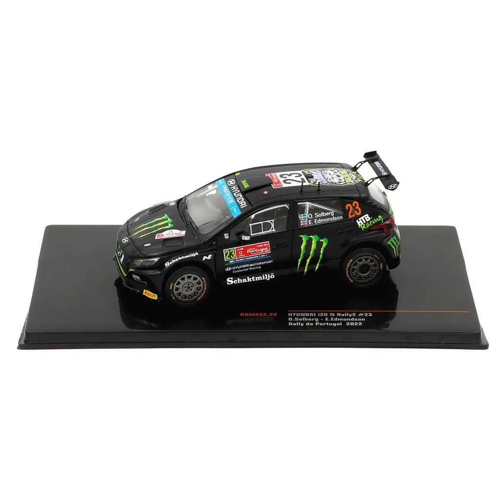 Oliver Solberg med Elliott Edmondson som kartläsare körde denna Hyundai i20 N under Rally de Portugal 2022. Modellen är tillverkad av Ixo Models i skala 1:43 (9,5 cm).