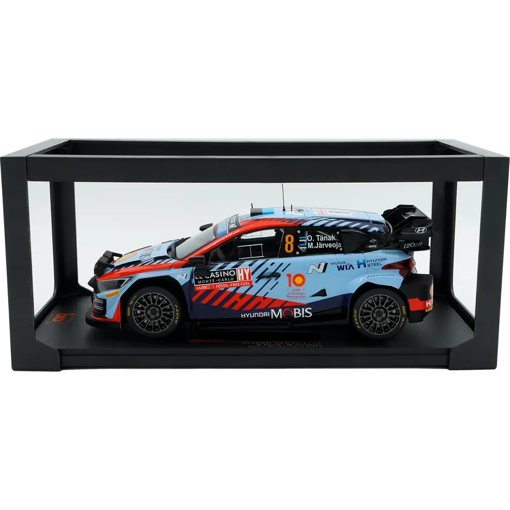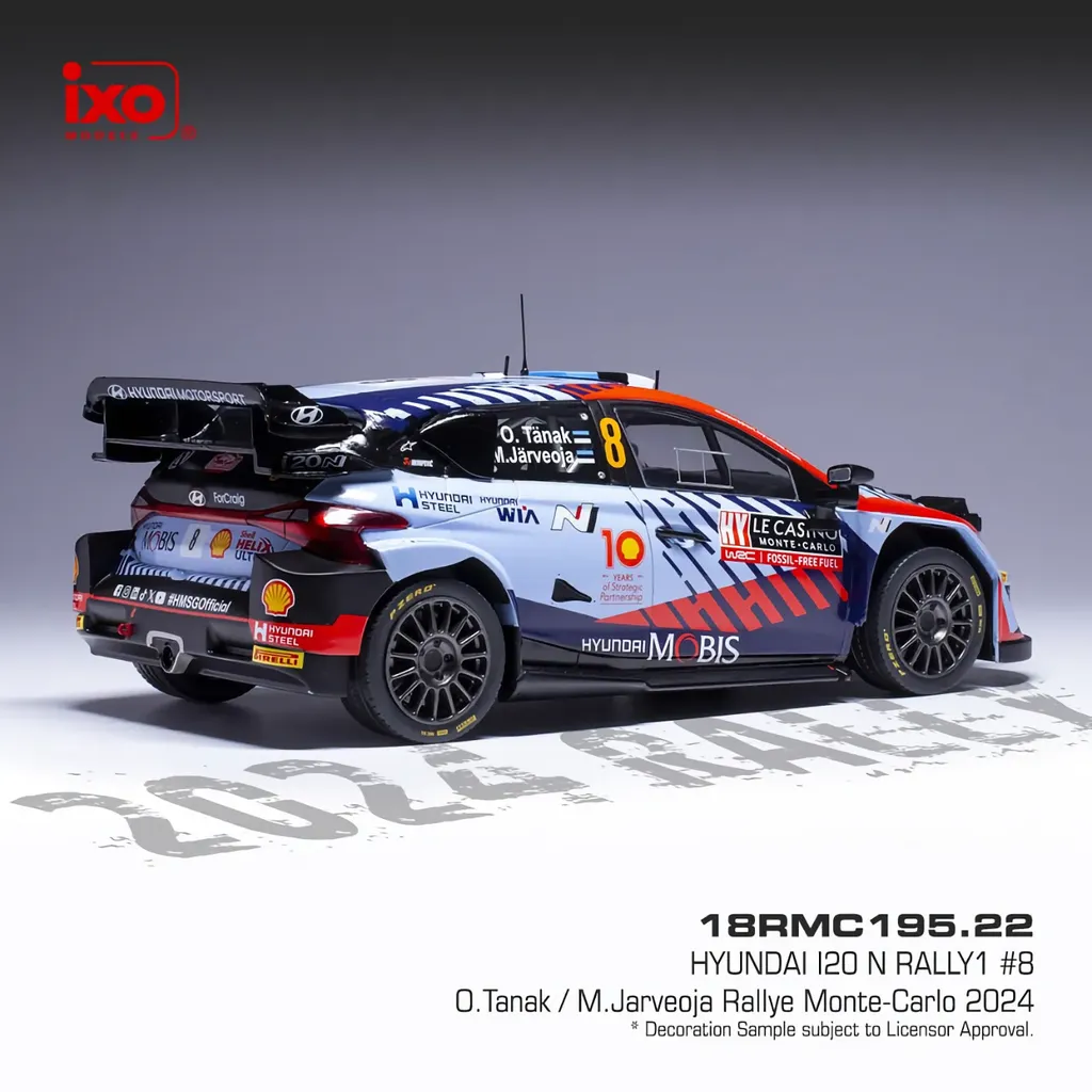 Modellen kommer monterad på en svart bottenplatta med modellens nummer och namn angivet, "18RMC195.22 - HYUNDAI i20 N Rally1 #8 - O.Tänak - M.Järveoja - Rallye Monte-Carlo 2024".