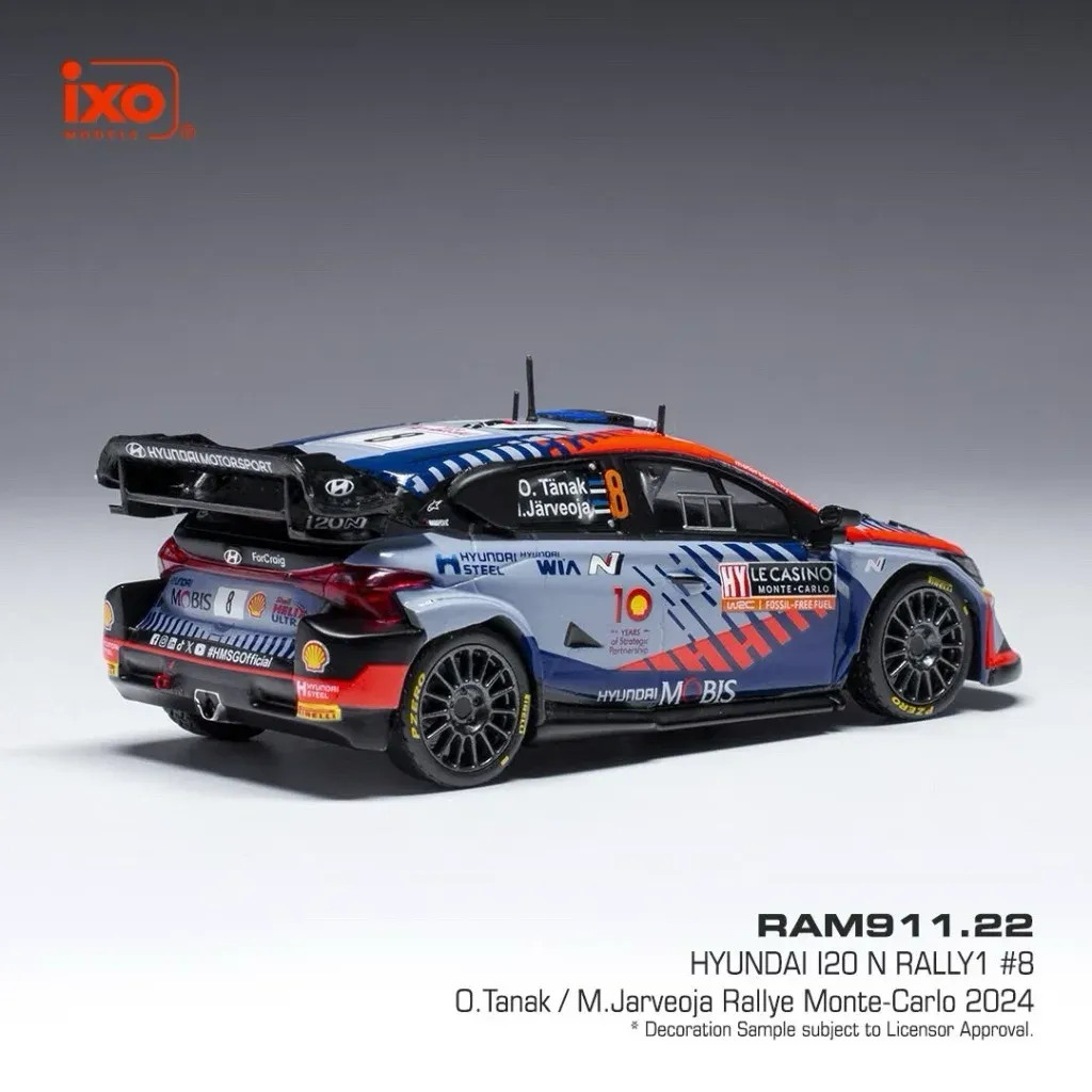 WRC-rallybilen Hyundai i20N Rally1 med nummer 8 som kördes av Tänak och Järveoja under Rallye Monte-Carlo 2024. Modellen är tillverkad av Ixo Models i skala 1:43 (10 cm).
