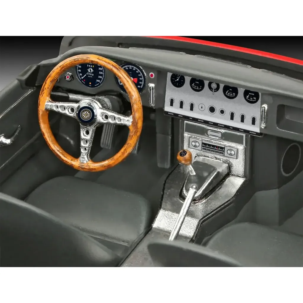 Med denna plastbyggsats från Revell ställs du inför utmaningen att bygga en Jaguar E-Type i skala 1:24. Färdigbyggd blir bilen 18,7 cm lång och 7,2 cm bred.